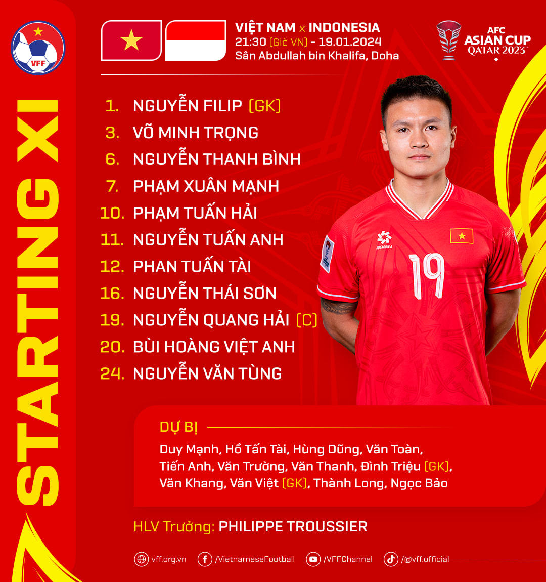 HLV Troussier có một số điều chỉnh ở đội hình xuất phát so với trận đấu vừa qua. Đình Bắc vắng mặt do chấn thương, Hùng Dũng xuất phát từ ghế dự bị. Tiền vệ Quang Hải ra sân từ đầu.