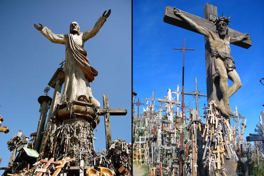 Giữa không gian bao la của những cánh đồng cỏ thẳng tắp đến chân trời, đồi thánh giá nhô lên như là tâm điểm thu hút sự chú ý. Khoảng sân lớn trước đồi dựng bức tượng lớn Chúa bị đóng đinh trên cây thánh giá và ven theo hai bên bậc thang trung tâm là trùng trùng điệp điệp những cây thánh giá dựng chống chất lên nhau. Hình ảnh Chúa Jesus, đức mẹ Maria, hình nộm và tràng chuổi cầu kinh phủ kín ngọn đồi. Nhìn những cây thánh giá hay chuỗi ngọc đã bạc màu, hoen ố màu đồng và chi chít những mạng nhện bao phủ, người ta thầm hiểu rằng ngọn đồi có thâm niên khá lâu trong tín ngưỡng của người Lithuania.