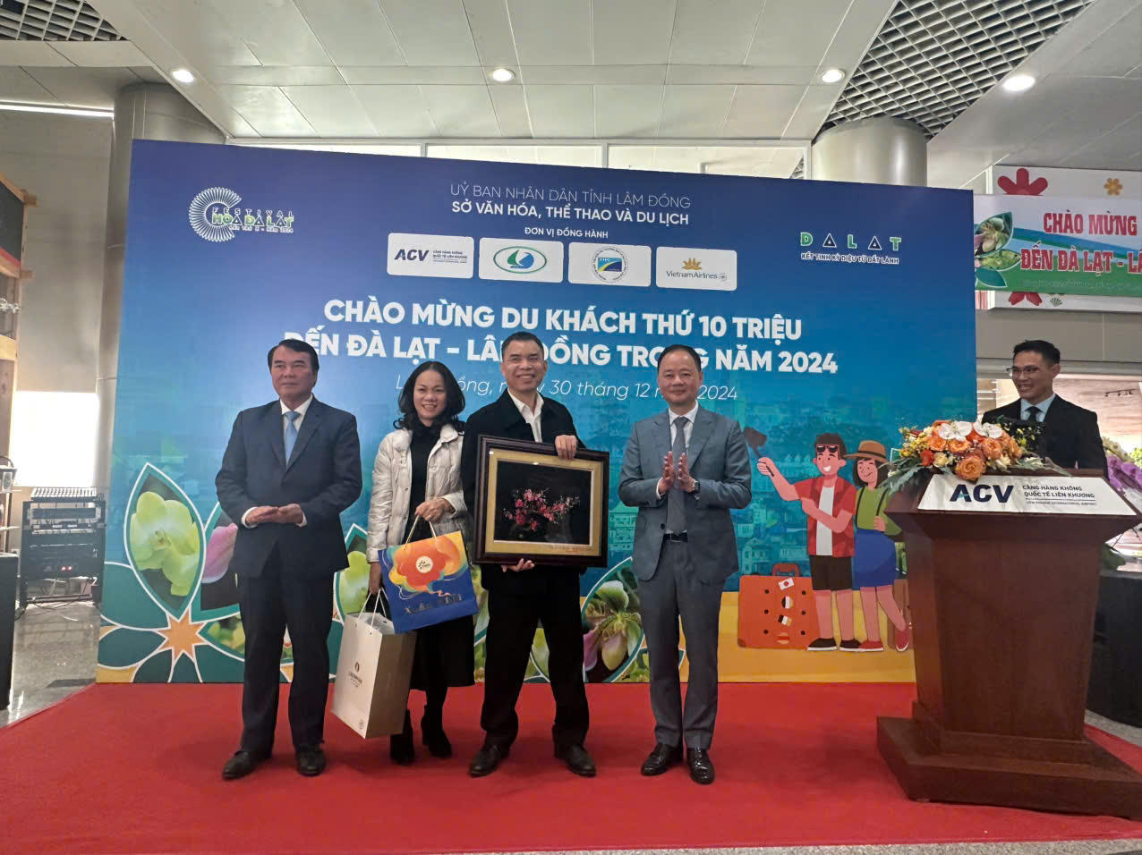 Lãnh đạo tỉnh Lâm Đồng tặng hoa cho vị khách thứ 10 triệu. |