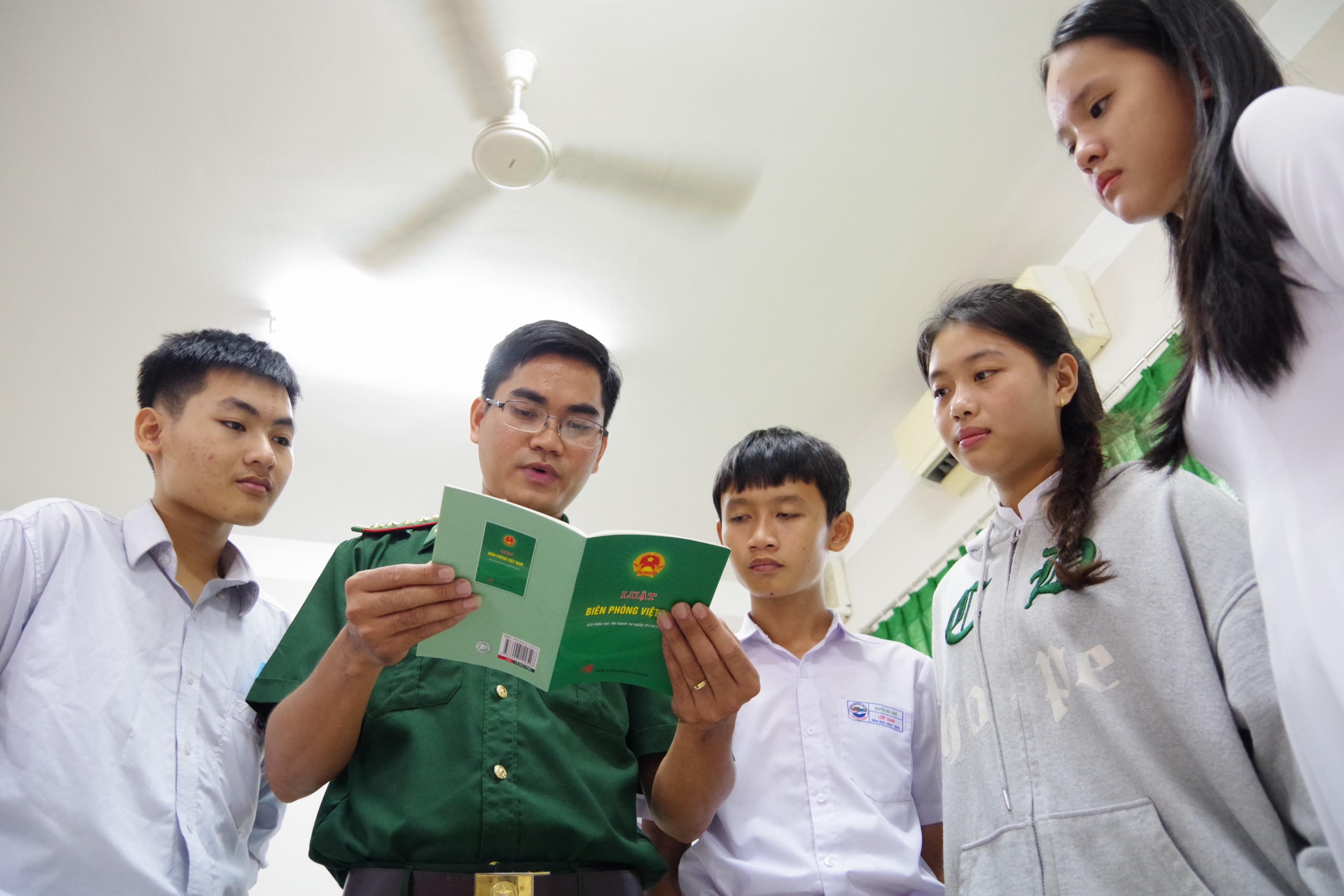 Cán bộ chiến sĩ BĐBP tuyên truyền luật Biên phòng cho học sinh (Hình: Quang Anh) |