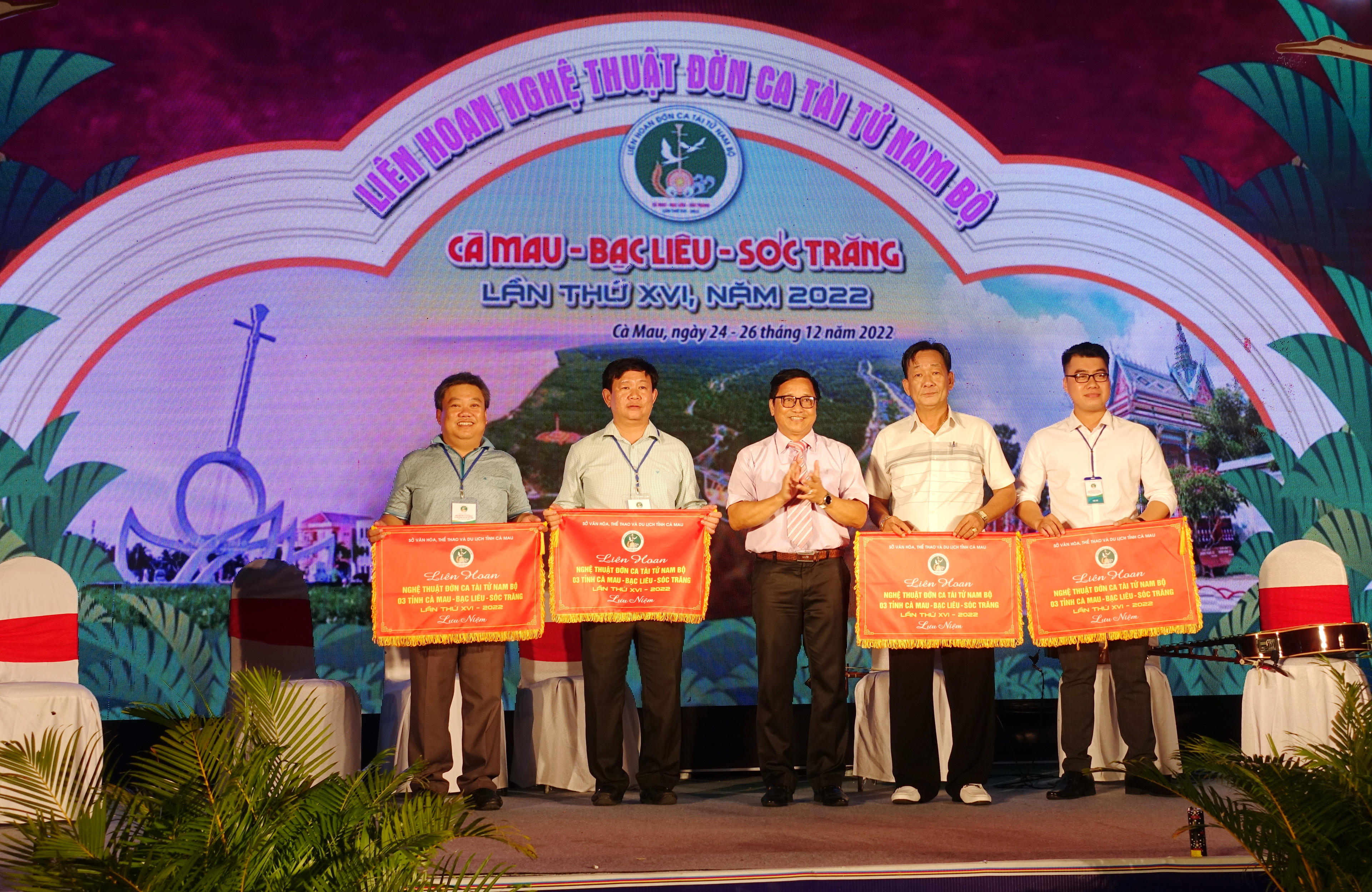 Ông Tạ Hoàng Hiện - Phó Giám đốc Sở Văn hóa Thể thao và Du lịch tỉnh Cà Mau trao cờ thi đua cho các đơn vị tham gia Liên hoan. |