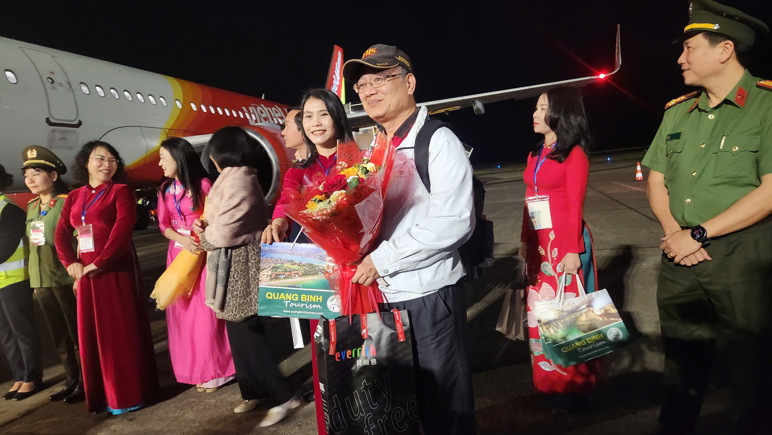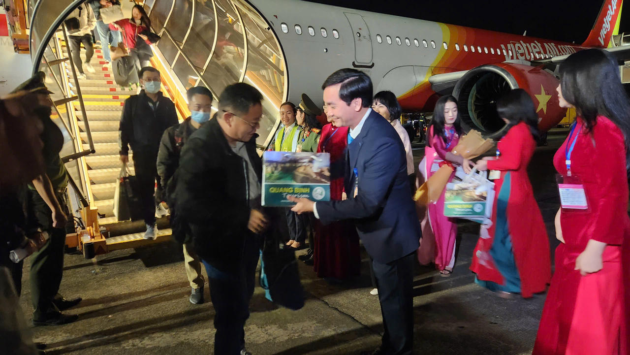 Ngay khi đặt chân đến TP. Đồng Hới, các hành khách và phi hành đoàn đã được bà Nguyễn Thị Bích Thủy, Giám đốc Sở Văn hóa, Thể thao và Du lịch cùng các doanh nghiệp lữ hành chào đón và tặng hoa chúc mừng.