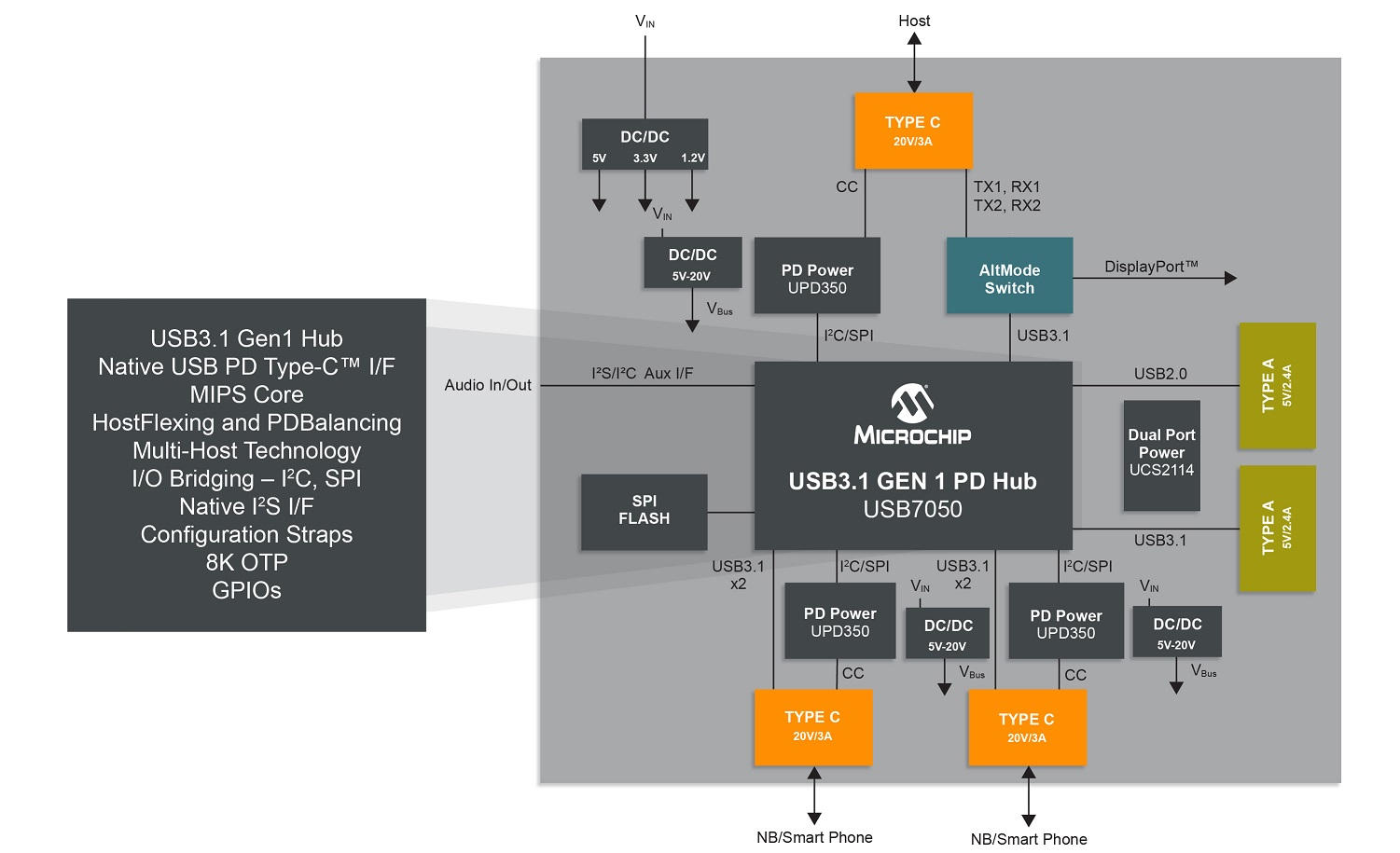 Để đáp ứng nhu cầu sạc và truyền dữ liệu trên các thiết bị di động nhanh hơn, dòng sản phẩm USB705x kết hợp hỗ trợ dành riêng cho USB Type-C PD với tốc độ dữ liệu 5 Gbps SuperSpeed của USB 3.1. Lý tưởng cho các dock sạc, màn hình PC và các thiết bị giải trí trên xe hơi, bao gồm dòng sản phẩm USB7050, USB7051, USB7052 và USB7056 cung cấp một loạt các cấu hình USB để đáp ứng các nhu cầu thiết kế PD và USB Type-C khác nhau. Ví dụ USB7056 hỗ trợ ba cổng USB Type-C có luồng dữ liệu upstream và downstream được kích hoạt chế độ PD trong khi USB7056 chỉ cung cấp một cổng upstream và 5 cổng downstream Type-A truyền thống. Các hub mới cũng cung cấp các ứng dụng hỗ trợ driver trên tất cả các thiết bị di động, cho phép hiển thị giao diện đồ họa người dùng của điện thoại trên màn hình xe hơi và có thể sạc thiết bị di động cùng lúc.