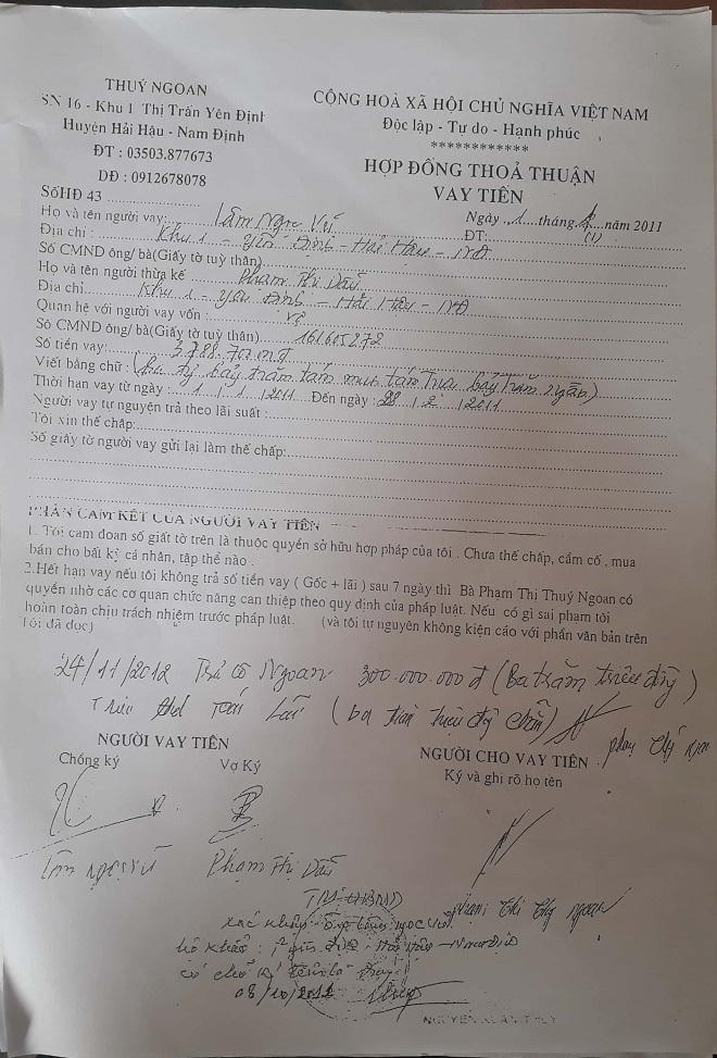 Điều đáng nói, hợp đồng vay tiền ngày 1/1/2011 có dấu hiệu được “lập khống”, không phù hợp với các quy định của pháp luật, trái với quy định về chứng thực chữ ký. Hợp đồng lập ngày 1/1/2011 nhưng mãi tới ngày 08/10/2011, ông Nguyễn Xuân Thủy – Phó chủ tịch UBND thị trấn Yên Định mới ký, đóng dấu xác nhận chữ ký của ông Vũ. Chưa kể số năm 2011 có dấu hiệu viết đè lên số 2012.