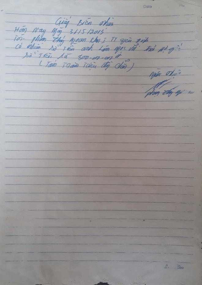 Một thời gian sau, tại nhà ông Nguyễn Hồng Quảng (khu 3, thị trấn Yên Định), ông Diệp lại tự viết tiếp một giấy vay nợ số tiền 4,5 tỷ đồng rồi đưa vợ chồng ông Vũ ký nhận, tuy nhiên ông Vũ nhất định không ký nên chỉ có ông Diệp và “người làm chứng” là bà Nguyễn Thị Thêu (thị trấn Yên Định) ký.
