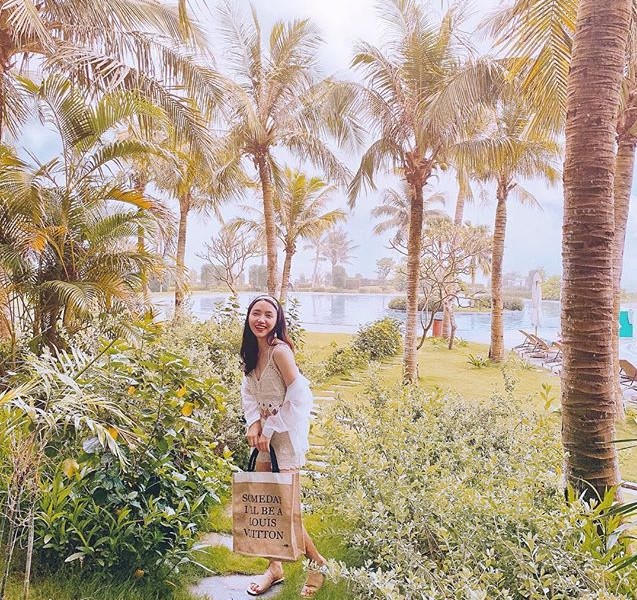 Lối dẫn đến bể bơi được thiết kế tinh tế với những hàng dừa xanh trên thảm cỏ như dẫn vào khung cảnh của miền nhiệt đới. Ảnh: @cherryphan8235