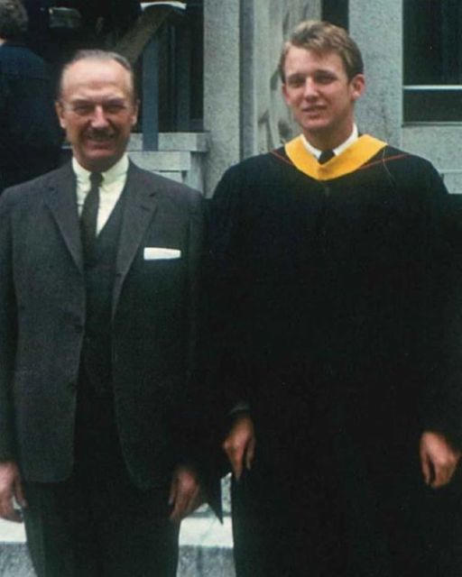 | Donal Trump (phải) cùng cha tại lễ tốt nghiệp của Trường Kinh doanh Wharton năm 1964 (ảnh trên trang Instagram của Donald Trump) |
