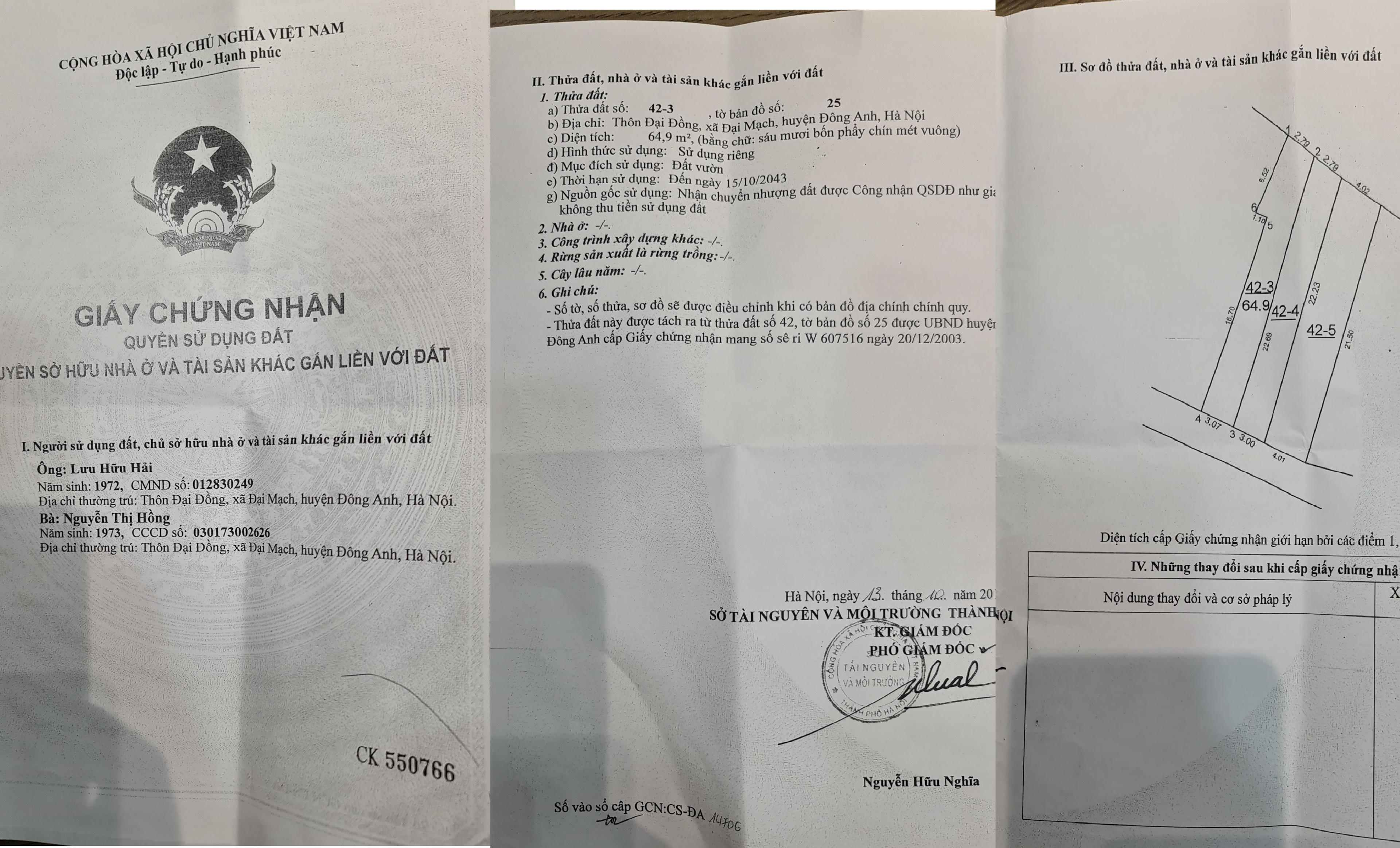 Theo ông Lưu Hữu Hải (thôn Đại Đồng, xã Đại Mạch, Đông Anh, Hà Nội) cho biết: Gia đình anh đang sở hữu một thửa đất số 42-3, tờ bản đồ số 25 với diện tích 64,9 m2 tại thôn Đại Đồng, xã Đại Mạch, Đông Anh, Hà Nội đã được Sở Tài Nguyên và Môi trường TP. Hà Nội cấp Giấy chứng nhận quyền sử dụng và tài sản gắn liền trên đất (GCNQSDĐ) số: CK550766 vào ngày 13/10/2017.