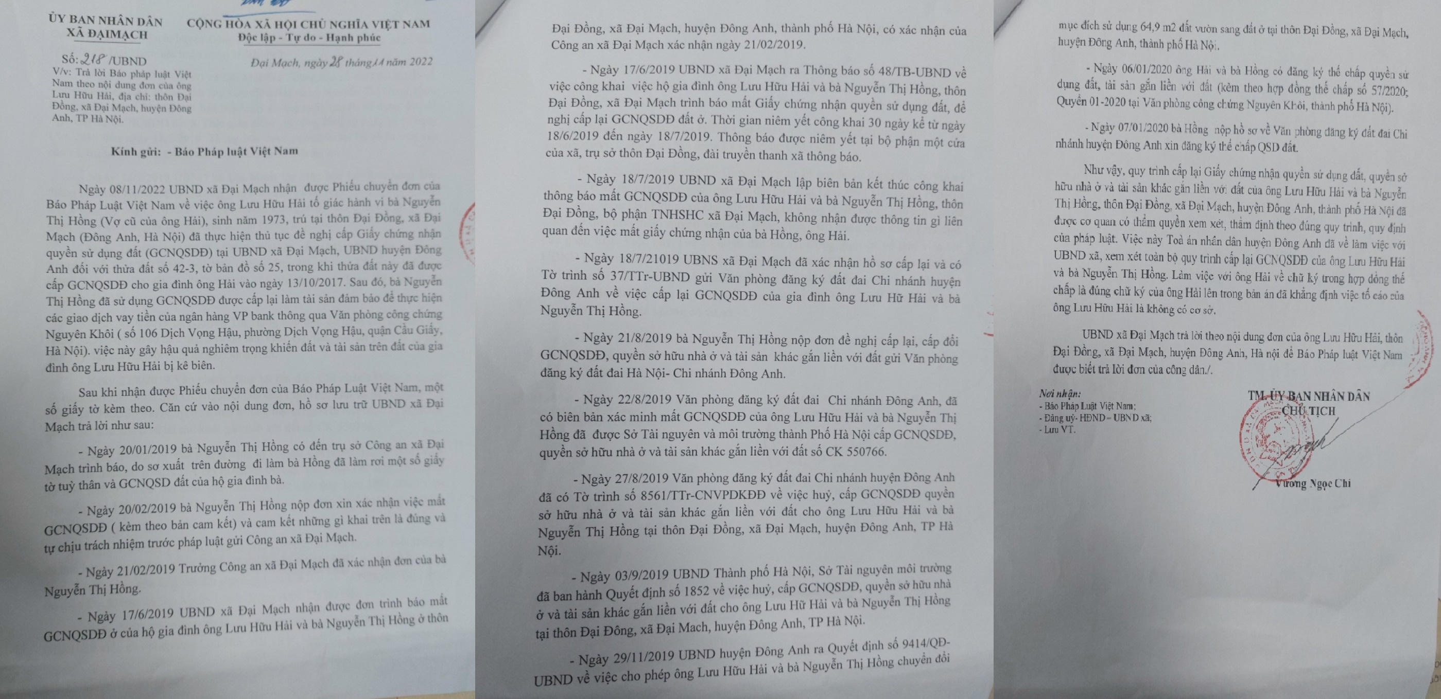 Trả lời báo Pháp luật Việt Nam về sự việc nêu trên, ông Vương Ngọc Chi - Chủ tịch UBND xã Đại Mạch cho biết: Ngày 20/01/2019 bà Nguyễn Thị Hồng đã đến trụ sở Công an xã Đại Mạch trình báo, do sơ suất trên đường đi làm bà Hồng đã làm rơi một số giấy tờ tùy thân và GCNQSDĐ của gia đình bà. Ngày 20/02/2019 bà Hồng nộp đơn xin xác nhận việc mất GCNQSDĐ và được Công an xã Đại Mạch xác nhận đơn.