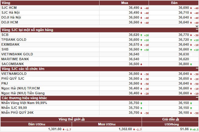 Tại Công ty SJC, giá vàng niêm yết chiều mua vào là 36,53 triệu đồng/lượng, ở chiều bán ra có mức giá là 36,75 triệu đồng/lượng. Tại thị trường TP.HCM, chiều bán ra niêm yết ở mức giá 36,73 triệu đồng/lượng.