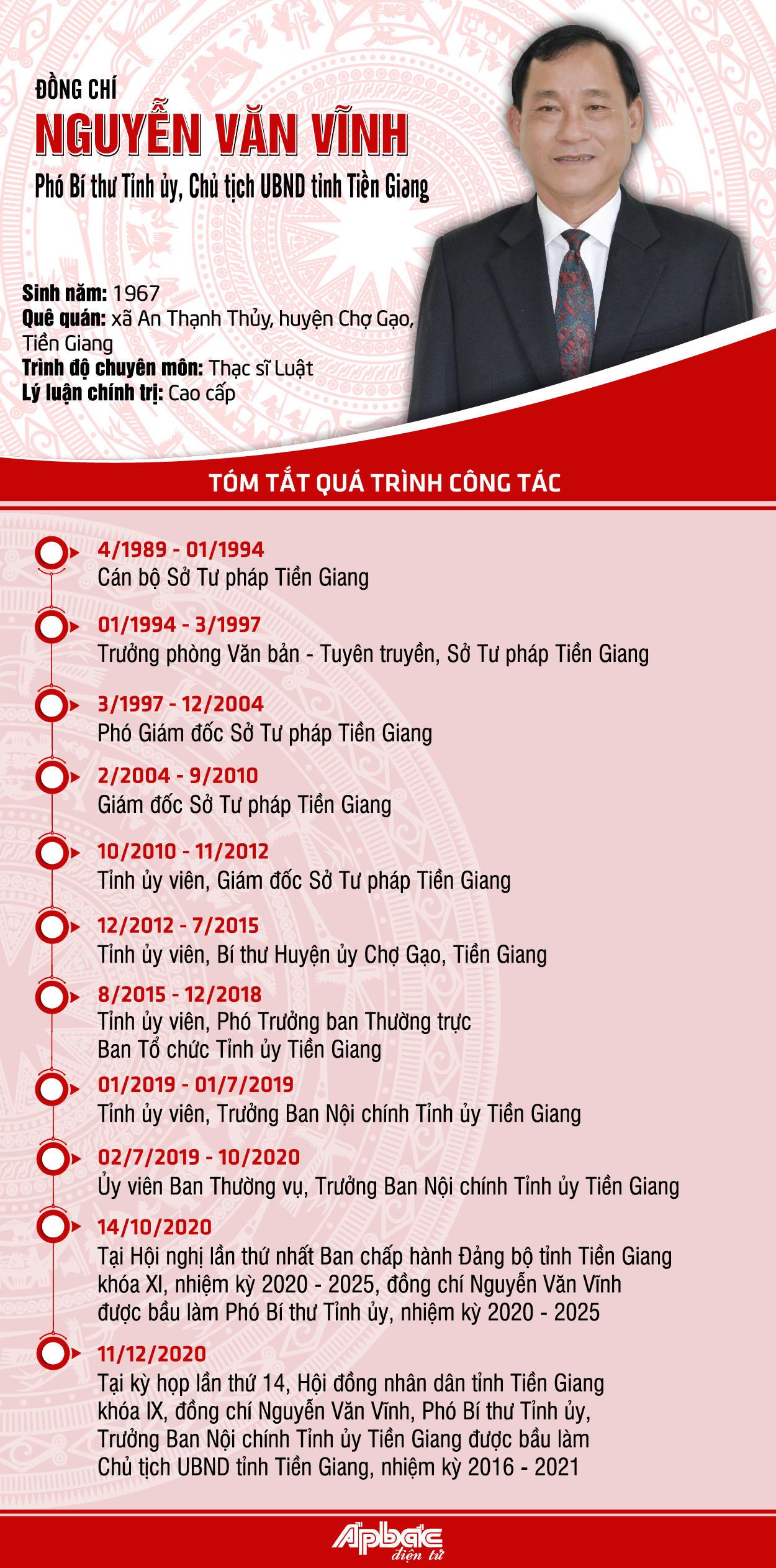 (PLVN) - Tại kỳ họp thứ 14 HĐND tỉnh Tiền Giang khóa IX, nhiệm kỳ 2016 – 2021, đồng chí Nguyễn Văn Vĩnh, phó bí thư Tỉnh ủy nhiệm kỳ 2020 - 2025, được bầu làm chủ tịch UBND tỉnh Tiền Giang.