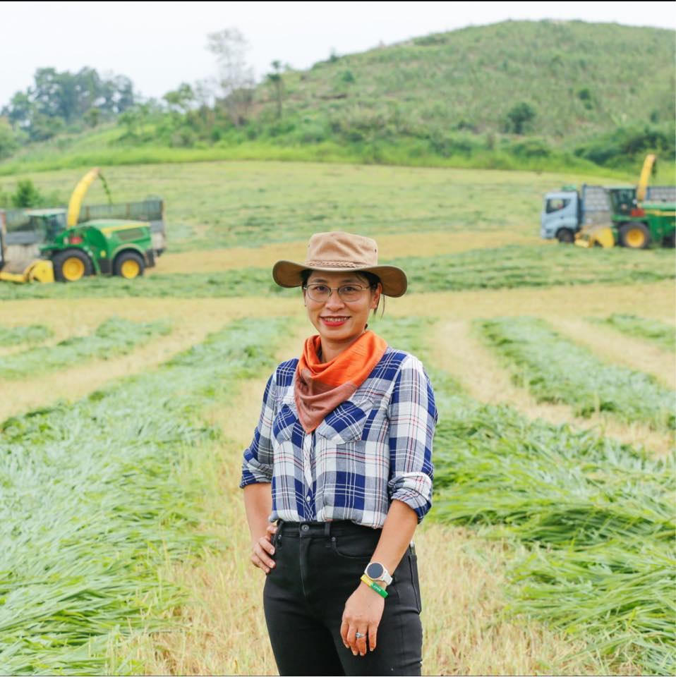 Một bạn gái tạo dáng ở đồng cỏ mombasa của trang trại TH. Ảnh: Facebook Vân Anh |