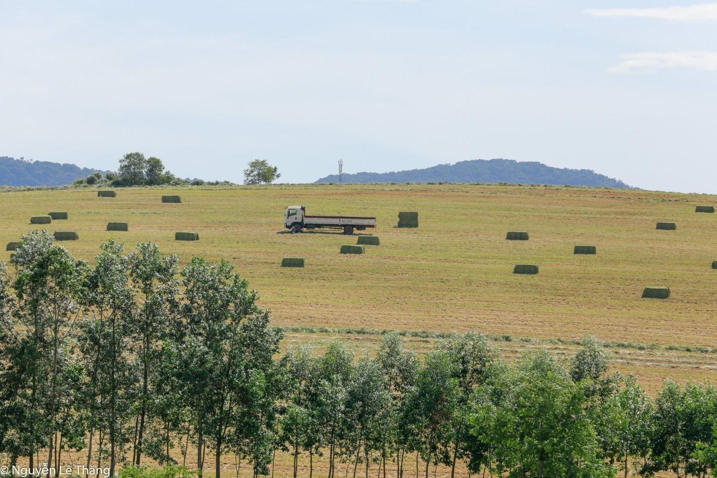 Cỏ được đóng bánh nằm trên đồng chờ được mang về các “nhà bếp 5 sao” phục vụ đàn bò sữa gần 70.000 con của TH true MILK. Ảnh: Lê Thăng |