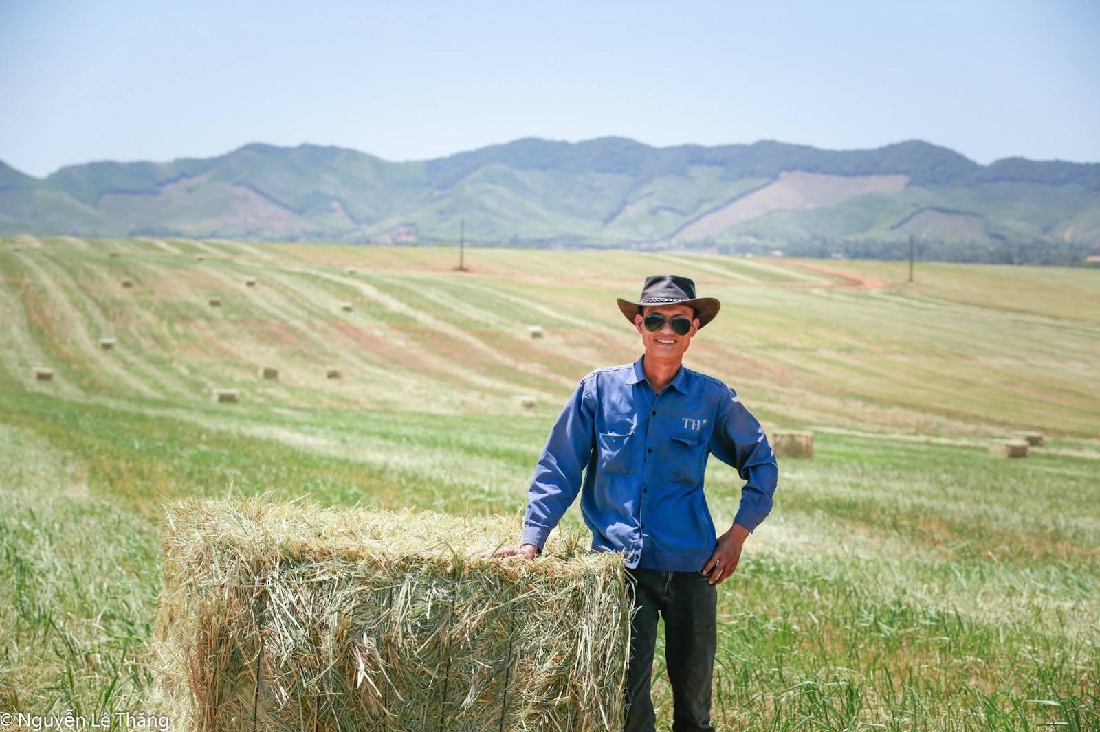 Một nhân viên TH bên bánh cỏ khô mới đóng. Ảnh: Lê Thăng |