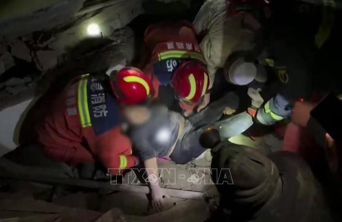 Lực lượng cứu hộ chuyển nạn nhân khỏi đống đổ nát sau trận động đất ở tỉnh Cam Túc, Tây Bắc Trung Quốc ngày 19/12/2023. Ảnh: CCTV/TTXVN