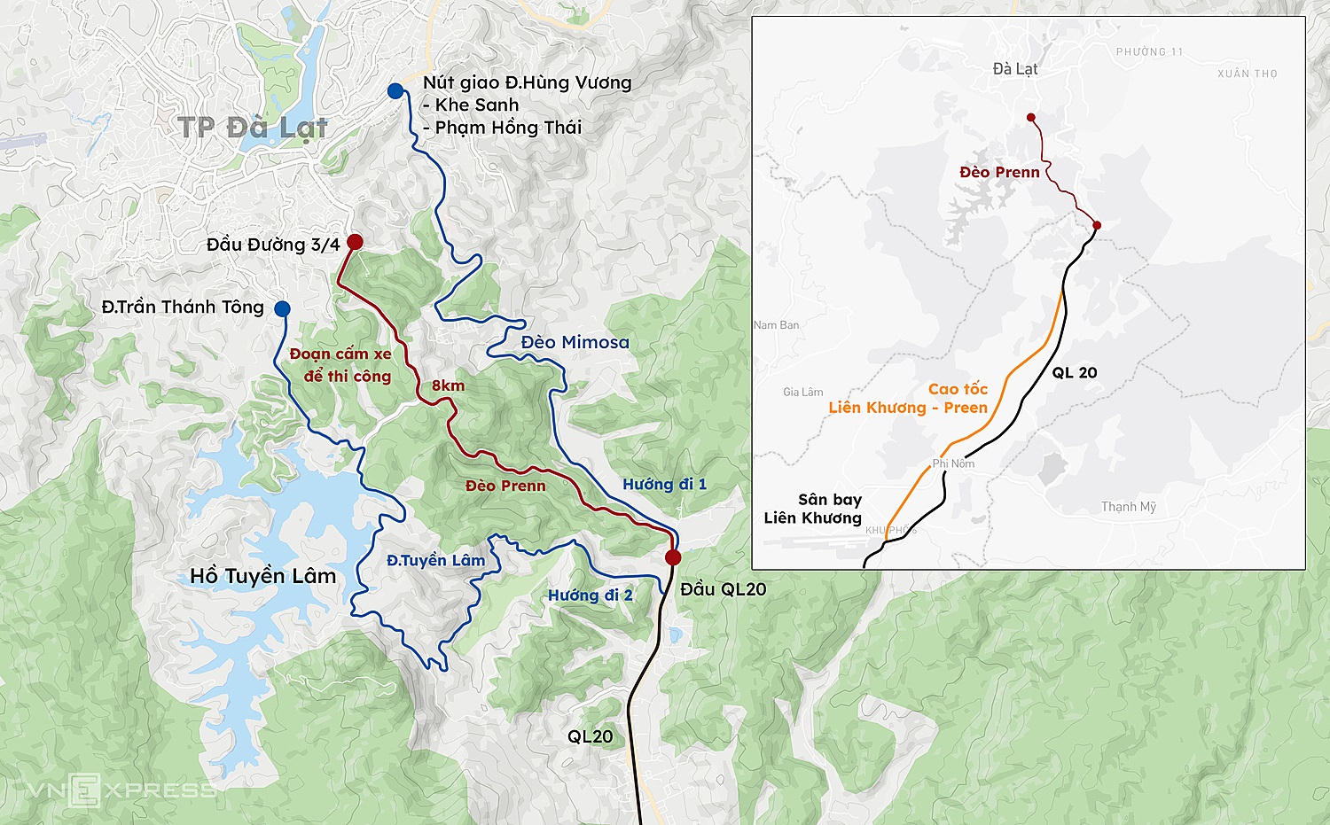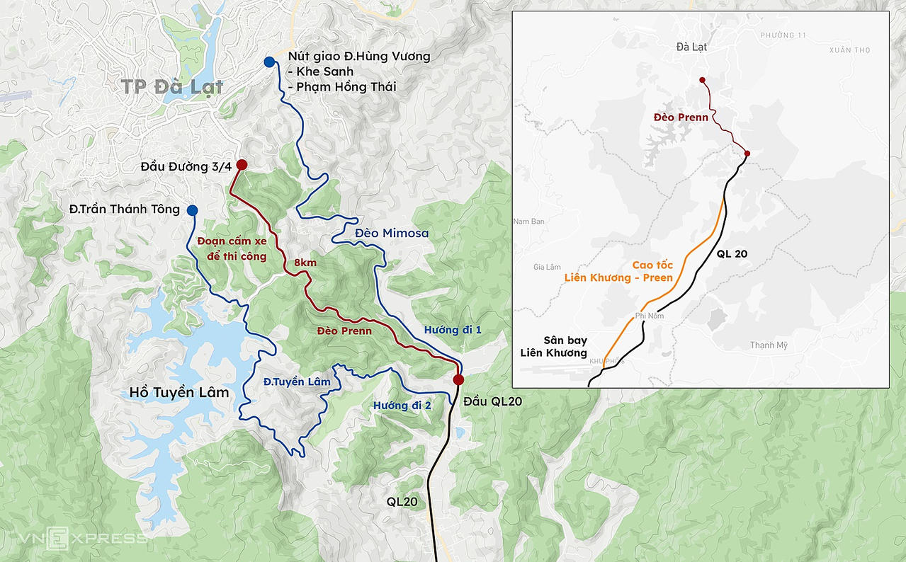 Hướng số 1, đoạn từ Cao tốc Liên Khương - Prenn lên đèo Mimosa và ngược lại sẽ không hạn chế các loại phương tiện.