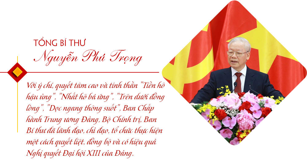 Tổng Bí thư Nguyễn Phú Trọng: Chúng ta đều đã biết, từ sau Đại hội XIII của Đảng đến nay, tình hình thế giới và khu vực có nhiều diễn biến nhanh chóng, phức tạp, khó lường; thách thức mới xuất hiện nhiều hơn so với dự báo. Với ý chí, quyết tâm cao và tinh thần "Tiền hô hậu ủng", "Nhất hô bá ứng", "Trên dưới đồng lòng", "Dọc ngang thông suốt", Ban Chấp hành Trung ương Đảng, Bộ Chính trị, Ban Bí thư đã lãnh đạo, chỉ đạo, tổ chức thực hiện một cách quyết liệt, đồng bộ và có hiệu quả Nghị quyết Đại hội XIII của Đảng. Đất nước ta đã vững vàng vượt qua nhiều khó khăn, thử thách, tiếp tục đạt được những kết quả to lớn, khá toàn diện và rất đáng mừng trên nhiều lĩnh vực.