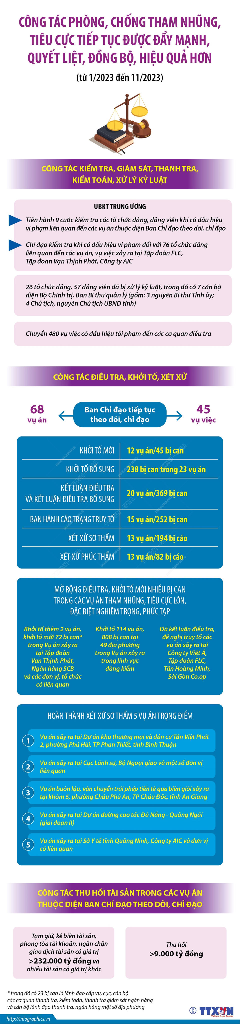 Tổng Bí thư Nguyễn Phú Trọng: Công tác đấu tranh phòng, chống tham nhũng, tiêu cực tiếp tục được thực hiện quyết liệt, với nhiều cách làm mới, có chiều sâu, đồng bộ, hiệu quả. Ban Chỉ đạo Trung ương về phòng, chống tham nhũng trước đây đã được bổ sung, mở rộng chức năng, nhiệm vụ, bao gồm cả chỉ đạo phòng, chống tham nhũng và phòng, chống "tiêu cực"; trọng tâm là phòng, chống sự suy thoái về tư tưởng chính trị, đạo đức, lối sống trong cán bộ, đảng viên, coi đây là gốc của mọi vấn đề.