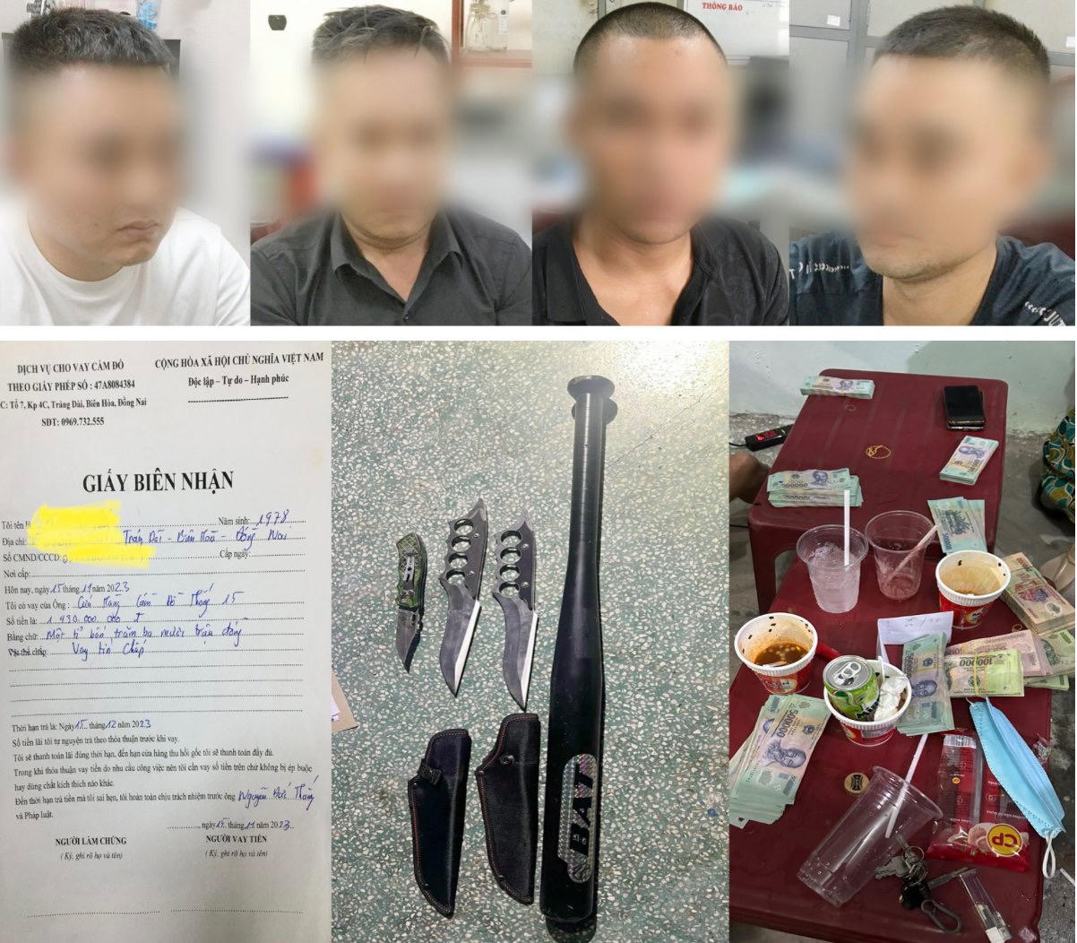 Trước đó, khuya ngày 15/11, Phòng Cảnh sát hình sự Công an tỉnh Đồng Nai phát hiện một nhóm đối tượng có hành vi đánh đập, đe doạ, uy hiếp, cướp tiền của một phụ nữ nghi vấn liên quan đến “tín dụng đen” tại một quán bán nước giải khát trên địa bàn khu phố 3, phường Trảng Dài, TP Biên Hoà, tỉnh Đồng Nai liền tiến hành kiểm tra và khống chế bắt quả tang.