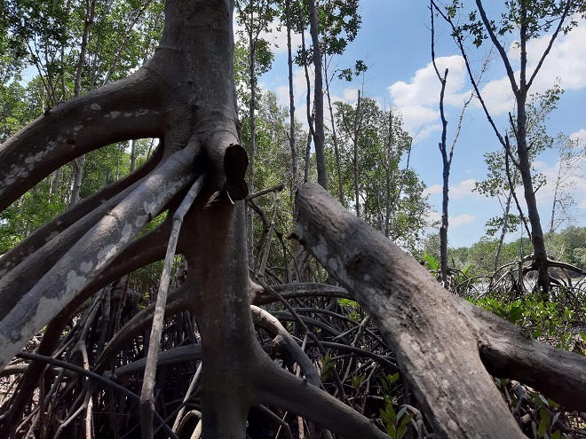 Ngồi trên ghe, phóng tầm mắt thấy bạt ngàn màu xanh rừng ngập mặn. Tuy nhiên người chèo ghe giải thích: “Khu này là rừng phòng hộ, dân sống ở đây chủ yếu làm nghề nuôi đánh bắt hải sản. Nhìn bề ngoài cây cối tùm lum thế thôi, vào sâu một đoạn có khi chẳng còn cây nào”.