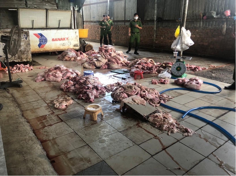 Trước đó, ngày 16/8, Công an TP Biên Hoà và lực lượng thú y ập vào cơ sở giết mổ, sơ chế thịt heo tại địa chỉ KP5, phường Long Bình do bà D.T.K. (46 tuổi) làm chủ. Tại thời điểm kiểm tra, cơ sở đang sơ chế khoảng 1,2 tấn thịt heo, nhưng thịt bỏ vương vãi trực tiếp trên sàn nhà dơ bẩn. Trong đó, rất nhiều thịt đã tím tái, bốc mùi hôi thối. Bước đầu, chủ cơ sở khai nhận số thịt trên được mua thu gom từ các trang trại nhỏ lẻ trong tỉnh Đồng Nai nhưng không có nguồn gốc xuất xứ. Sau đó, sẽ được xử lý sơ bộ, rồi đóng gói phân phối đi các tỉnh tiêu thụ. Sau khi lập biên bản vi phạm, Công an đã lập hồ sơ tiêu huỷ theo quy định.