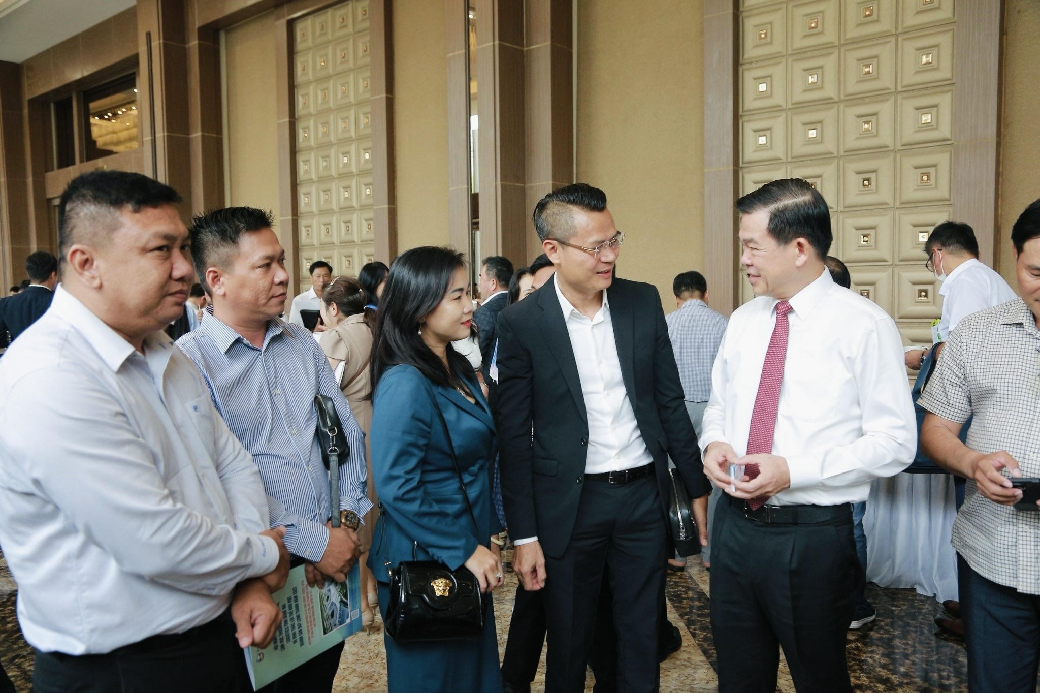 Bí thư Tỉnh uỷ Nguyễn Hồng Lĩnh trao đổi với các doanh nghiệp bên lề hội nghị. |