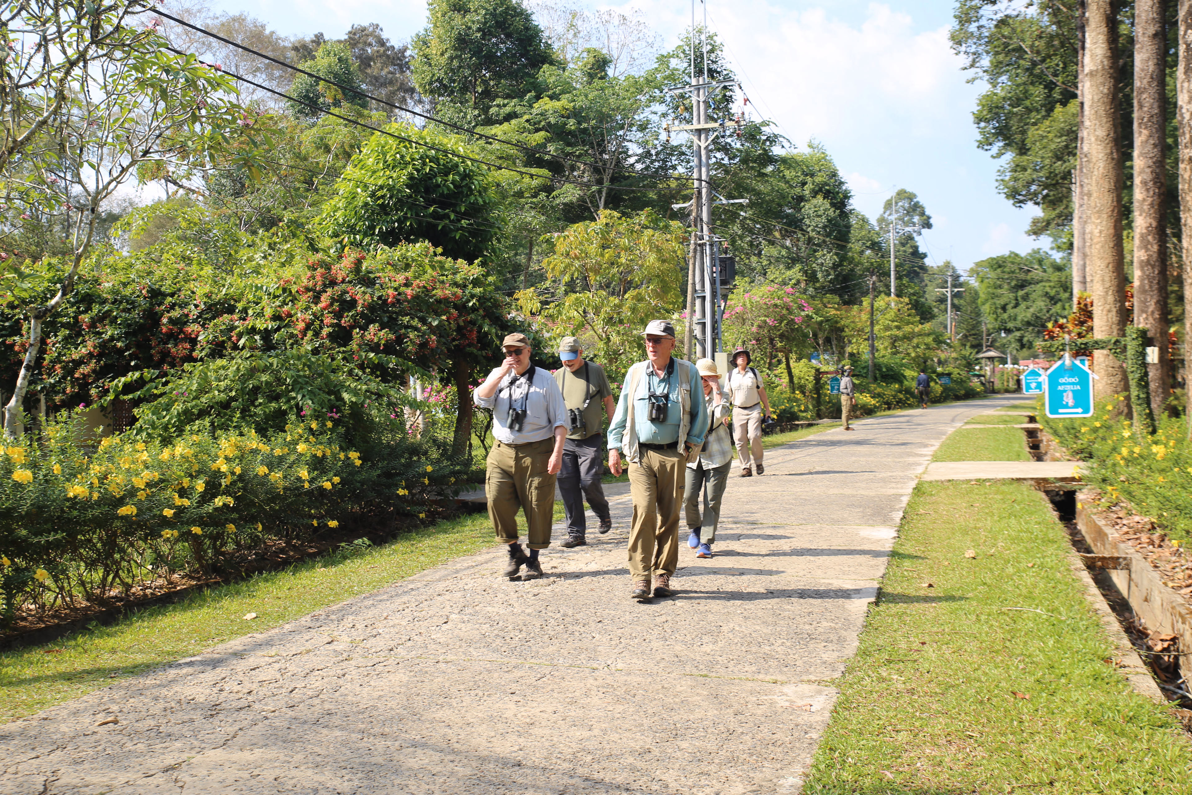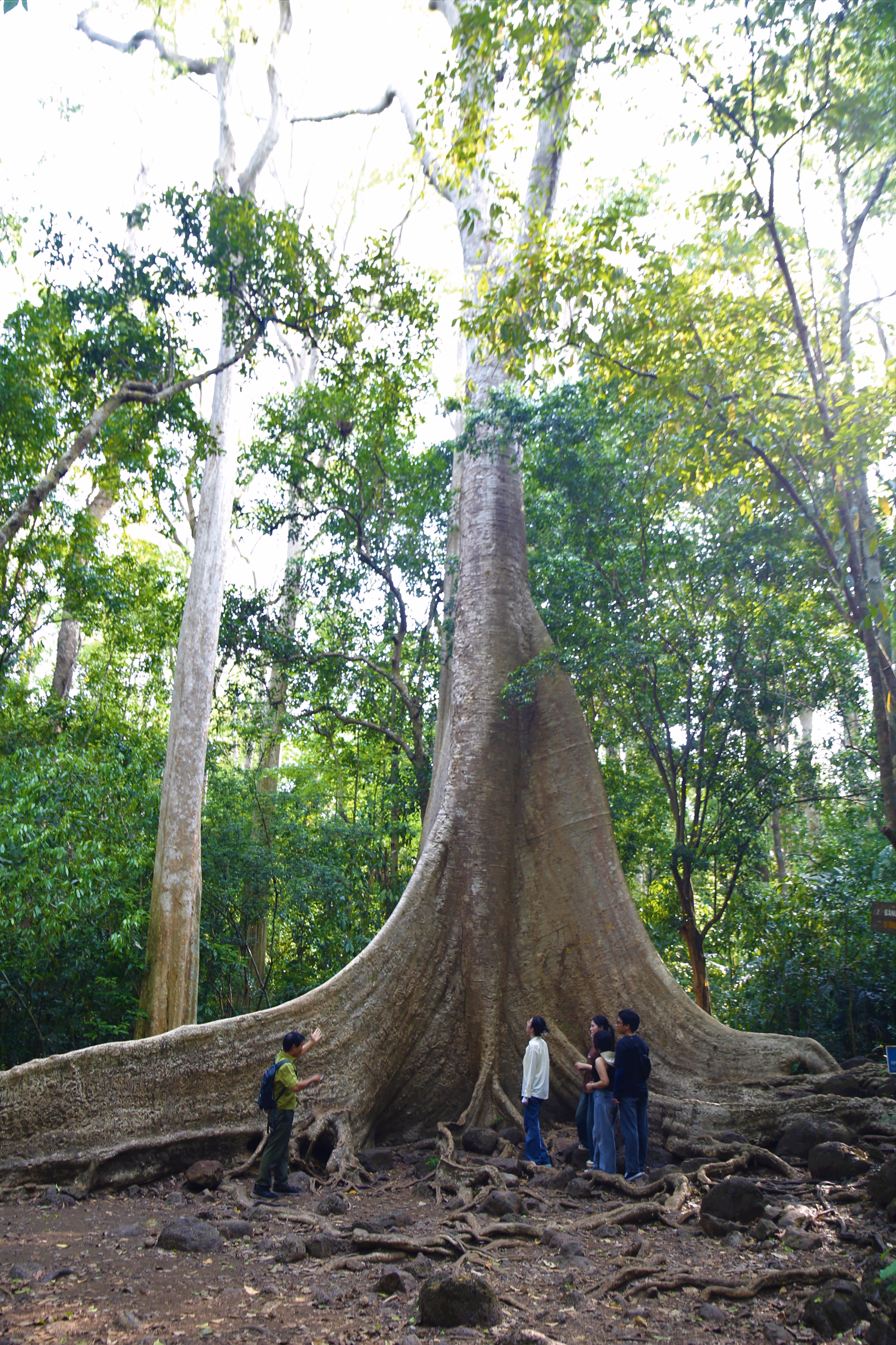 Theo ghi nhận, cây cầu nối khu dân cư với rừng Cát Tiên vẫn đang trong quá trình xây dựng nên muốn qua sông phải đi bằng phà. Sau đó rẽ phải chừng 500m, tiếp tục đi bộ vào rừng sẽ bắt gặp cây Tung 400 tuổi. Mùa nắng nên cây Tung trơ cành lá để ít phải “đâm rễ” xuống sâu lòng đất tìm nguồn nước. Bộ rễ của cây Tung to, dài nổi lên mặt đất, “bò qua lại, ngổn ngang” giống con thằn lằn thời tiền sử. Vì lẽ đó, người ta thường gọi cây Tung là “cụ thằn lằn sấm”. Tại đây, chúng tôi gặp sinh viên Đỗ Thị Thuý Hằng (ngành du lịch, khoa Khoa học- Nhân văn, Trường Đại học Tôn Đức Thắng, TP.Hồ Chí Minh) cùng nhóm bạn đến vườn để khảo sát cho đề tài nghiên cứu Marketing xanh. Nữ sinh viên cho biết: “Em thấy việc bảo vệ môi trường ở đây rất tốt. Dọc đường vào rừng có thùng rác, điểm ăn uống, vệ sinh, thuận tiện cho du khách trải nghiệm. Tụi em đi xe đạp vào rừng nhưng không thấy mệt mỏi vì được nhiều cây xanh phủ bóng mát”. Còn ông Michael (người Mĩ) lần đầu tiên đến vườn nghiên cứu, tham quan, du lịch và cảm thấy thoải mái, dễ chịu vì không khí trong lành. Ông cho biết sẽ ở lại vài ngày để tận hưởng sự kỳ diệu của thiên nhiên, chụp hình đẹp về động, thực vật làm tư liệu phục vụ nghiên cứu bảo tồn rừng, đa dạng sinh học.