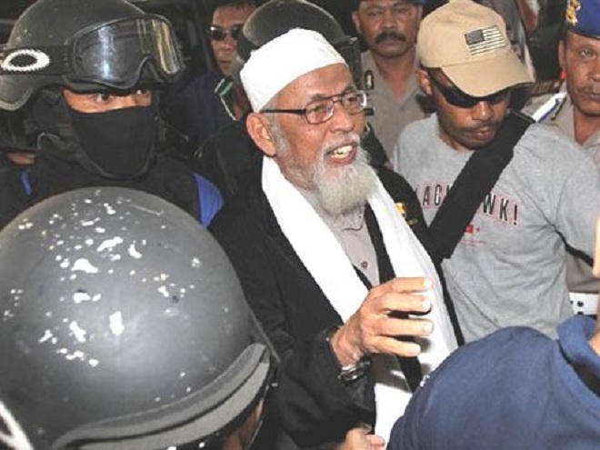 | Abu Bakar Bashir - cựu lãnh đạo tổ chức khủng bố Jemaah Islamiyah và là chủ mưu loạt vụ đánh bom đẫm máu ở Bali, Indonesia năm 2002 - bị dẫn giải về trụ sở cảnh sát Jakarta |