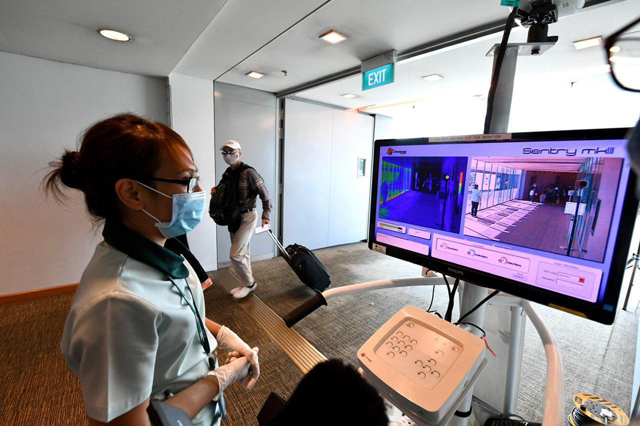 Giám sát hành khách phòng dịch tại sân bay Changi (Singapore) tháng 1/2020. Ảnh: Straits Times |