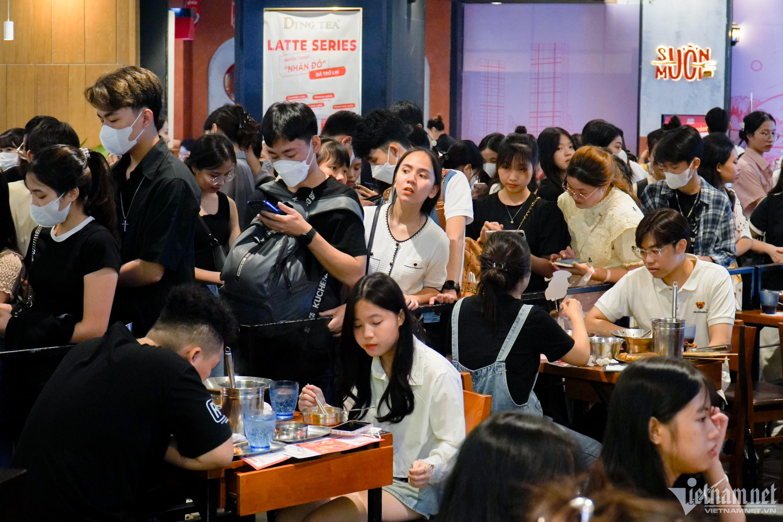 Các Trung tâm thương mại cũng ken kín người. 12h30 tại một hàng lẩu kiểu Hàn Quốc, khách phải xếp thành 2 hàng chờ có bàn để vào ăn trưa Ảnh: Vietnamnet |