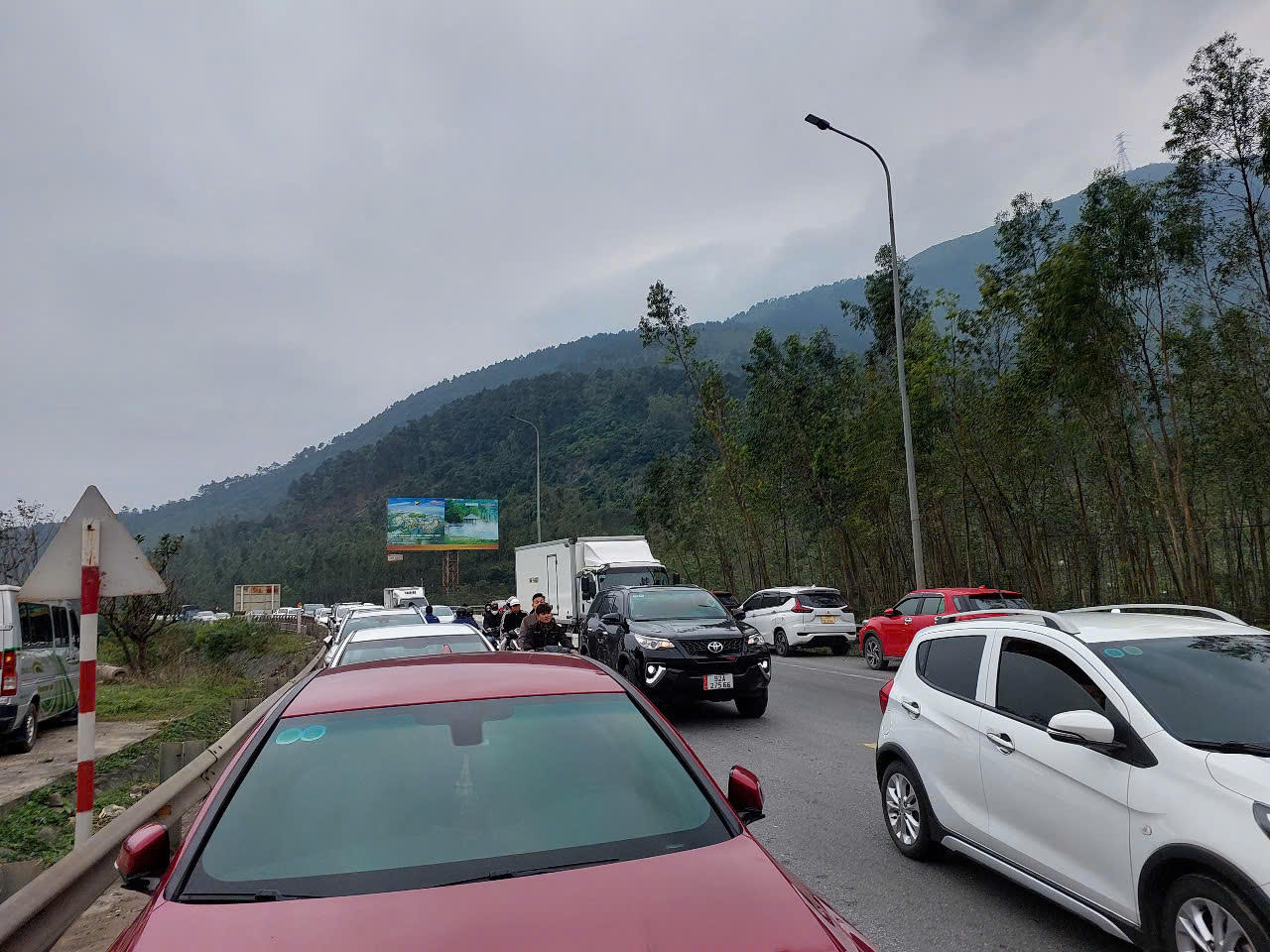 Ngay từ ngoài lối rẽ vào đền, hàng dài ô tô đỗ kín dọc theo Quốc lộ 1A . |