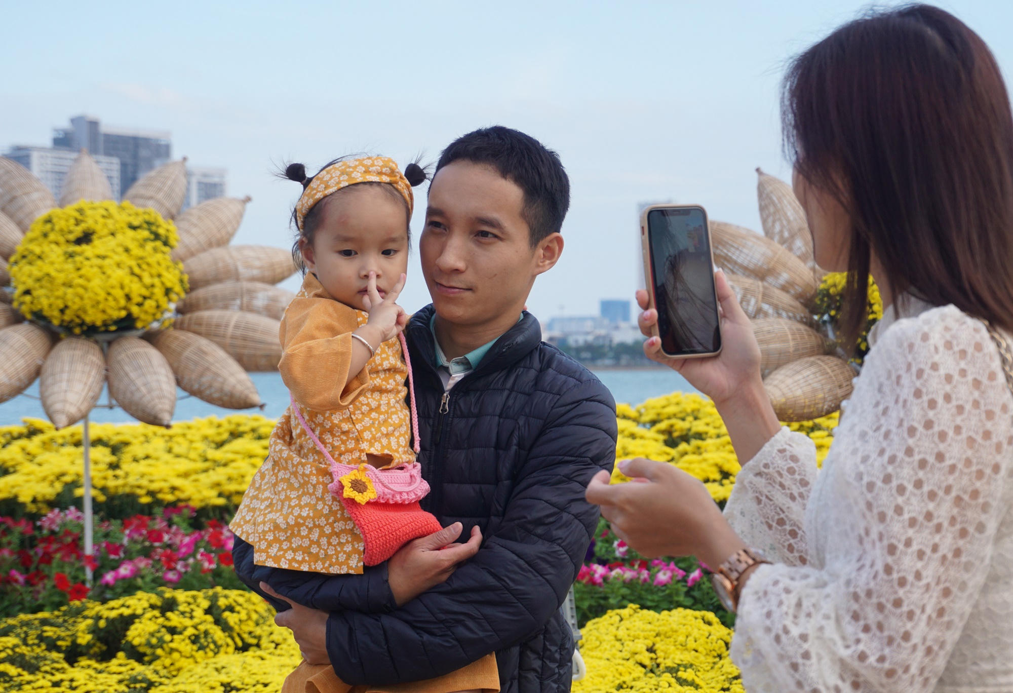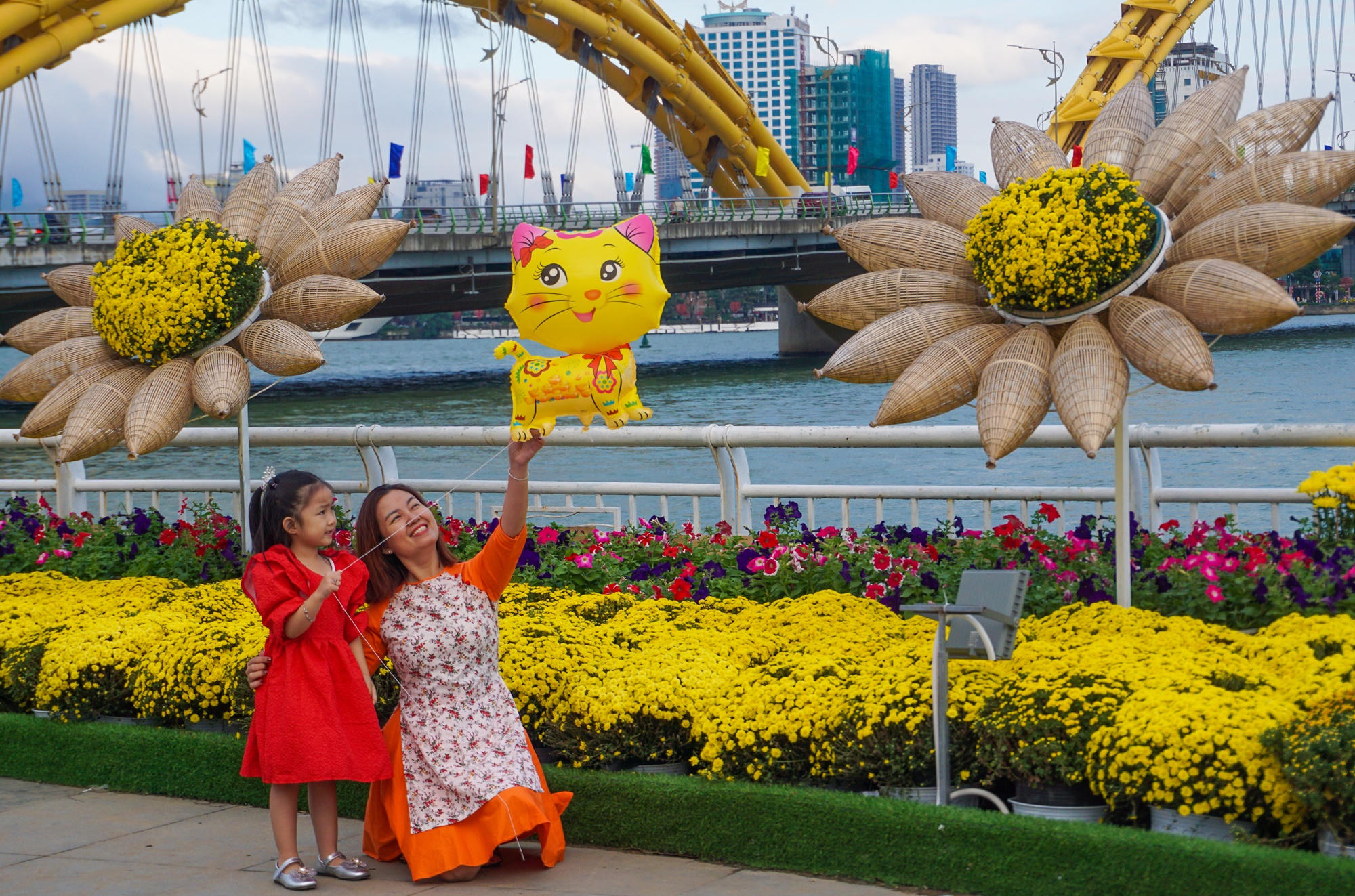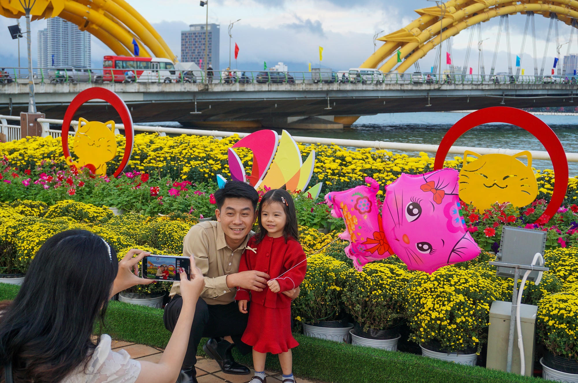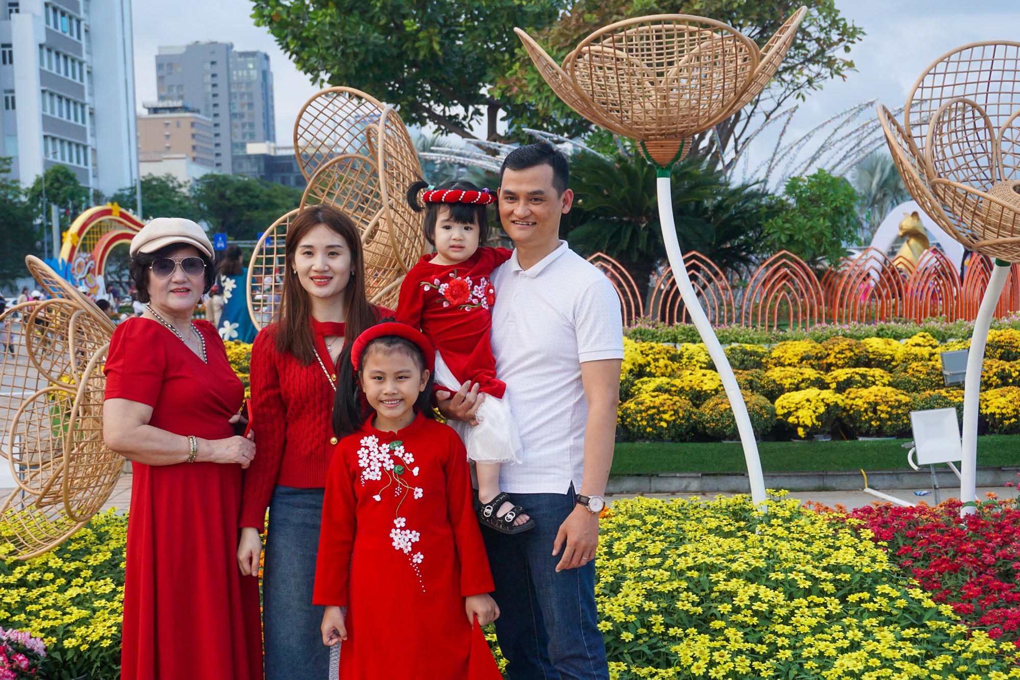 Một gia đình phấn khởi check-in tại đường hoa Tết Quý Mão 2023 ở Đà Nẵng.