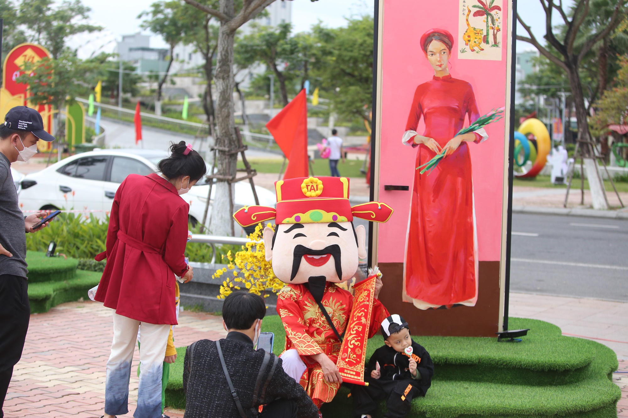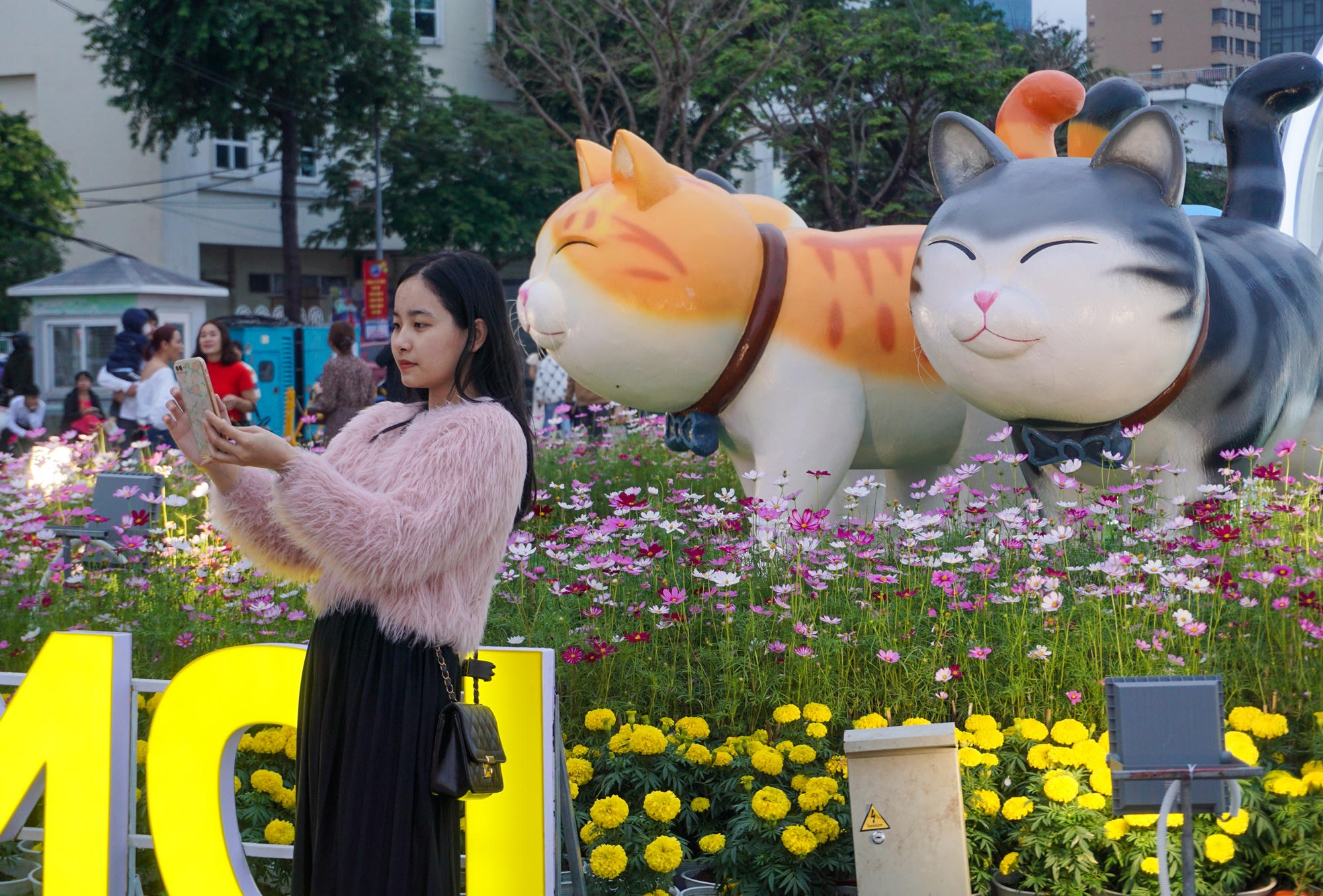 Tại đường hoa xuân khu vực trước cầu chữ T, rất nhiều gia đình gồm nhiều thế hệ đến du xuân, chụp ảnh lưu niệm bên linh vật mèo ngộ nghĩnh, đáng yêu.