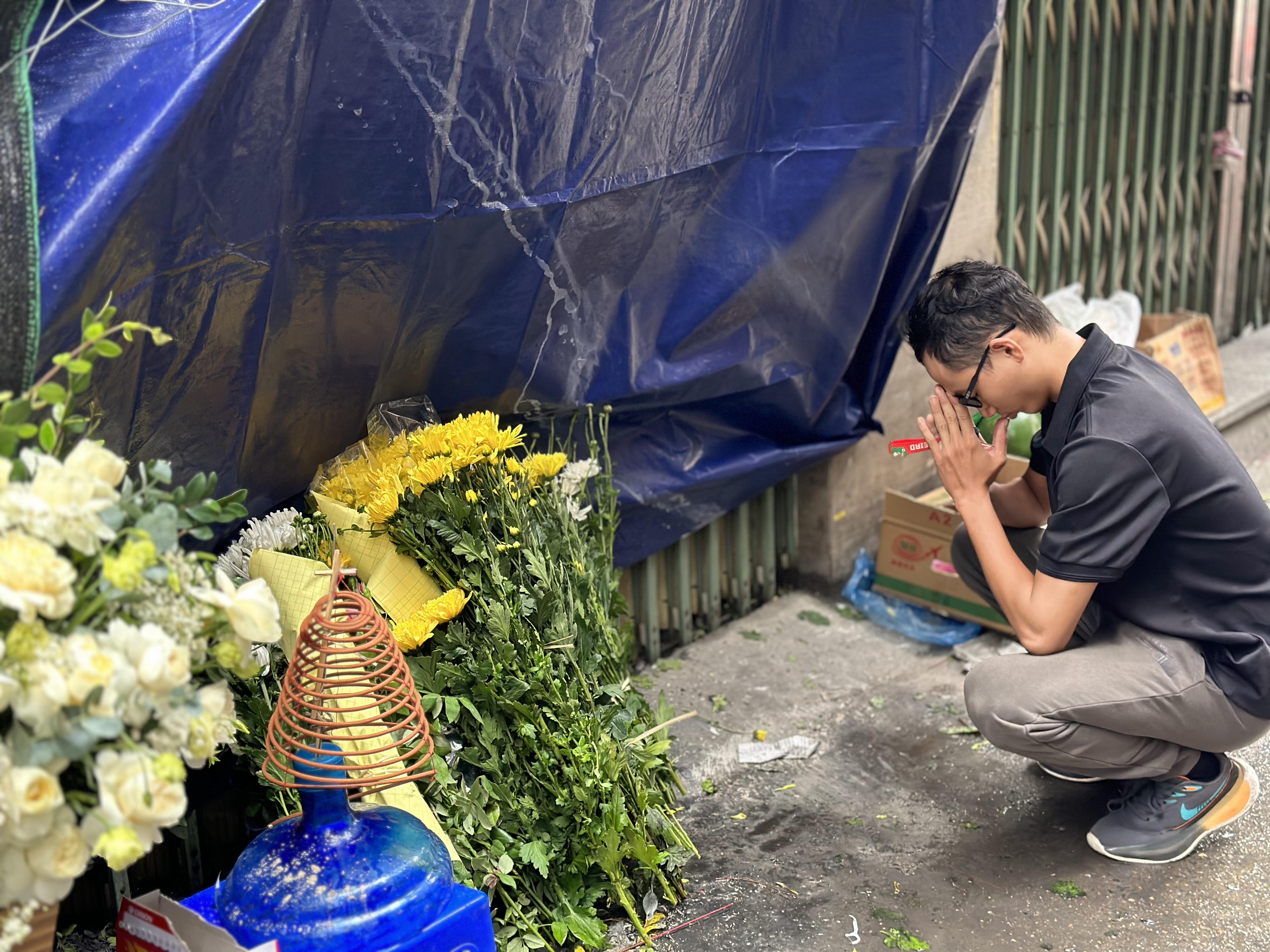 Khu vực hiện trường vẫn vương mùi khét, các mảng tường đen bong tróc. Chị Nguyễn Thị Hải, nhà ở phố Nguyễn Trãi, quận Thanh Xuân, chia sẻ: “Tối qua tôi đã đến đây thắp hương, sáng nay, đầu tháng nên cũng đến đặt bó hoa, thắp hương tưởng nhớ những người xấu số.