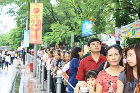 Mặc cho trời mưa, hàng nghìn người dân từ các miền Bắc, Trung, Nam vẫn lặng lẽ đứng xếp hàng nối dài trước Lăng Chủ tịch Hồ Chí Minh để được vào Lăng viếng Bác nhân dịp Quốc Khánh 2/9. Có người đi hàng nghìn km từ các tỉnh vùng sâu vùng xa, hải đảo, hồi hộp, xúc động, rưng rưng nước mắt khi lần đầu tiên được đến Thủ đô và nhất là đến với vị Lãnh tụ kính yêu của dân tộc Việt Nam....