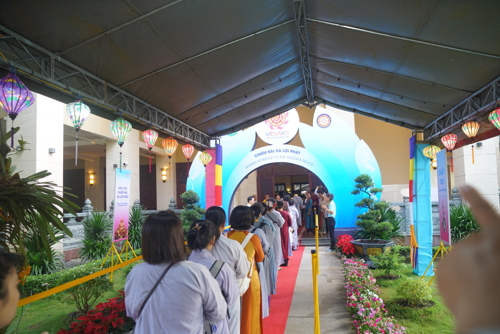 Cứ khoảng một tiếng đồng hồ, hàng trăm người lại được ban tổ chức hướng dẫn, trật tự tiến vào khu vực tôn trí xá lợi để thực hiện nghi lễ chiêm bái.