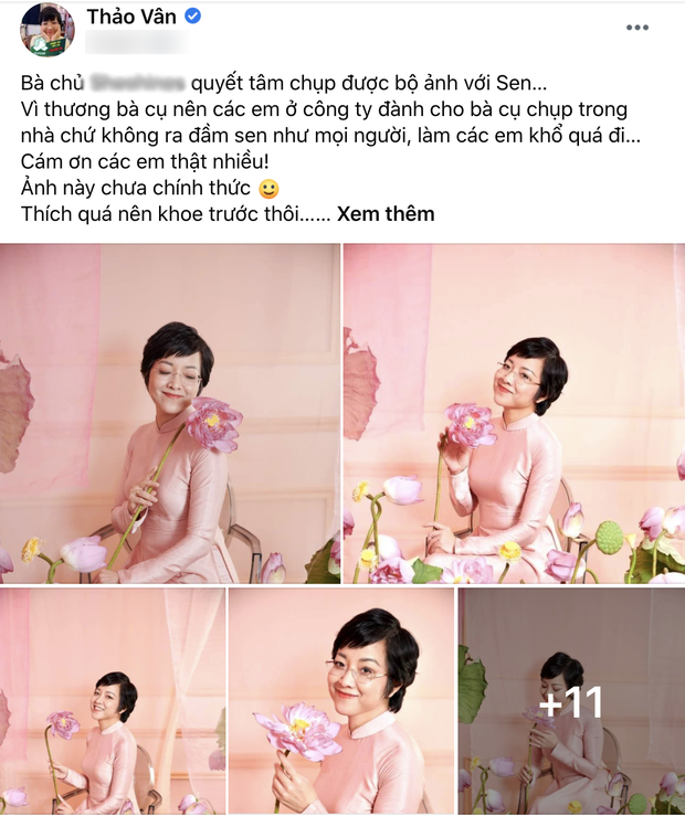 Trên trang cá nhân, nữ MC tâm sự: "Bà chủ quyết tâm chụp được bộ ảnh với sen. Vì thương bà cụ nên các em ở công ty đành cho bà cụ chụp trong nhà chứ không ra đầm sen như mọi người, làm các em khổ quá đi… Cám ơn các em thật nhiều! Ảnh này chưa chính thức. Thích quá nên khoe trước thôi".