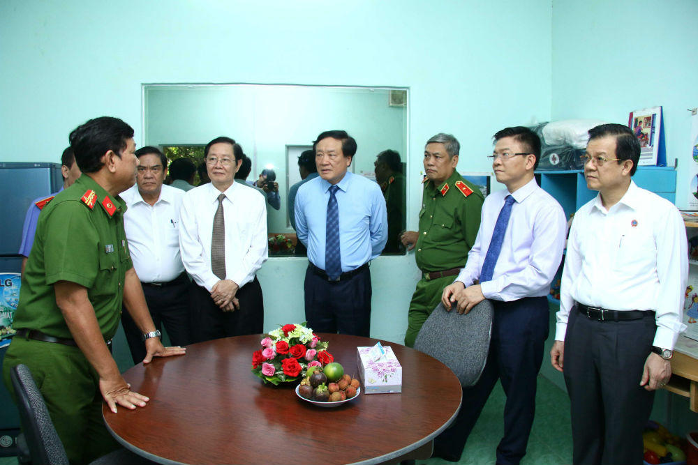 | Chánh án TANDTC Nguyễn Hòa Bình, Bộ trưởng Bộ Tư pháp Lê Thành Long cùng các đại biểu tham quan phòng điều tra thân thiện của Công an tỉnh Đồng Tháp