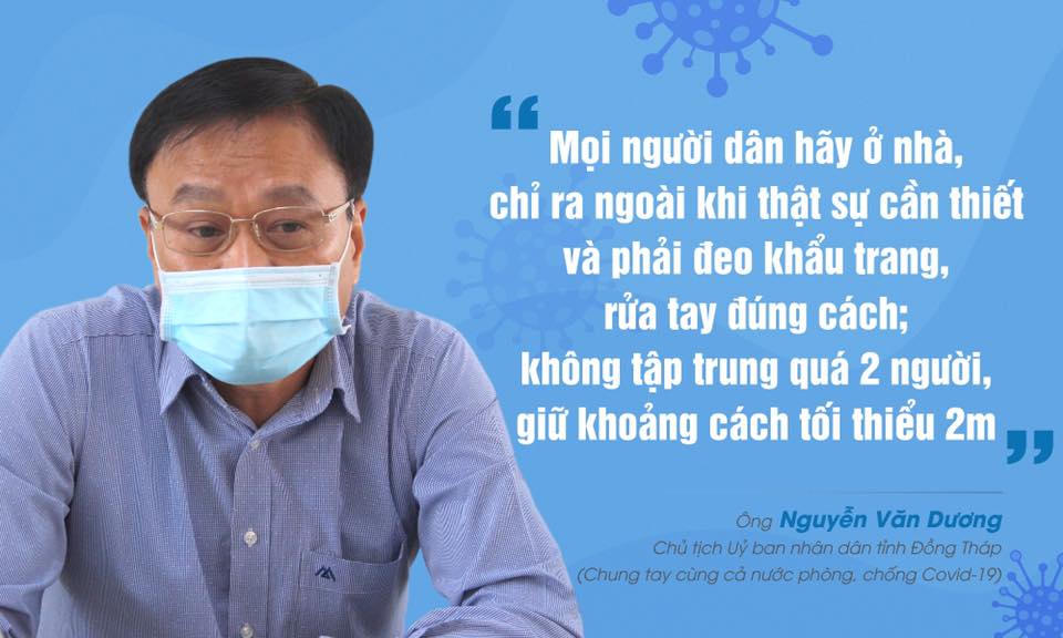 Đồng thời, Chủ tịch UBND tỉnh cũng lưu ý thêm, người dân Đồng Tháp hãy tiếp tục ở tại nhà, chỉ ra ngoài trong trường hợp thật sự cần thiết, giữ khoảng cách tối thiểu 2m khi giao tiếp. Trường hợp ra khỏi nhà phải đeo khẩu trang, rửa tay bằng xà phòng hoặc dung dịch sát khuẩn.