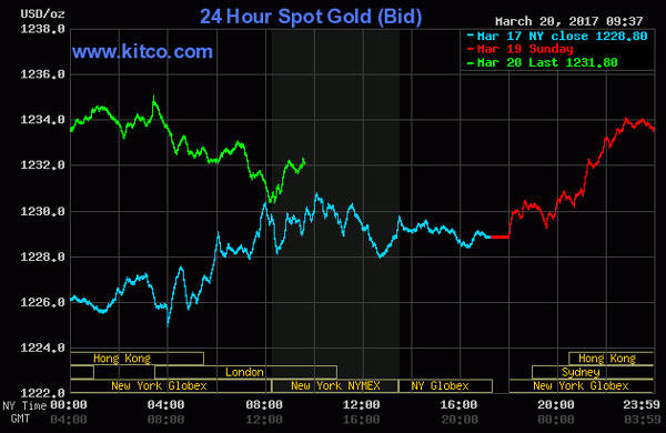 (PLO) - Sáng 21/3 (giờ Việt Nam), giá vàng thế giới giao ngay đứng ở mức 1.231,9 USD/ounce. Giá vàng trong nước tăng 50-70 ngàn đồng/lượng so với cuối tuần trước mặc cho đồng USD giảm phiên thứ 4 liên tiếp.