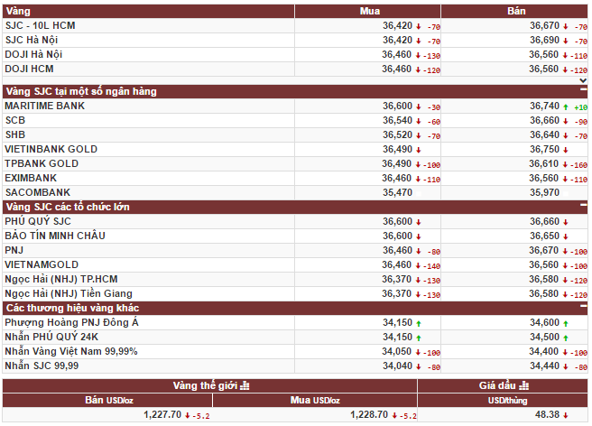 Chốt phiên 20/3, Tập Đoàn Vàng bạc đá quý DOJI niêm yết giá vàng SJC ở mức: 36,59 triệu đồng/lượng (mua vào) và 36,67 triệu đồng/lượng (bán ra). Công ty vàng bạc đá quý Sài Gòn niêm yết vàng SJC ở mức: 36,49 triệu đồng/lượng (mua vào) và 36,76 triệu đồng/lượng (bán ra).