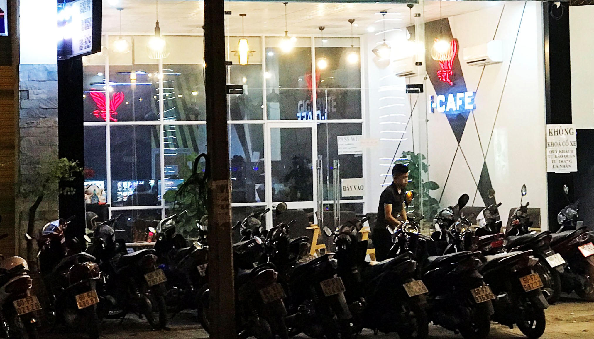 Tiệm có hai căn phòng rộng chừng 20m2/phòng, lắp đặt khoảng 20 máy tính. Phần lớn khách đến chơi giờ này là giới trẻ. Mùi thuốc lá, mùi thức ăn khuya, mùi mồ hôi ngột ngạt. Thỉnh thoảng có người bực tức la lên, kèm theo những tiếng chửi thề thô tục.
