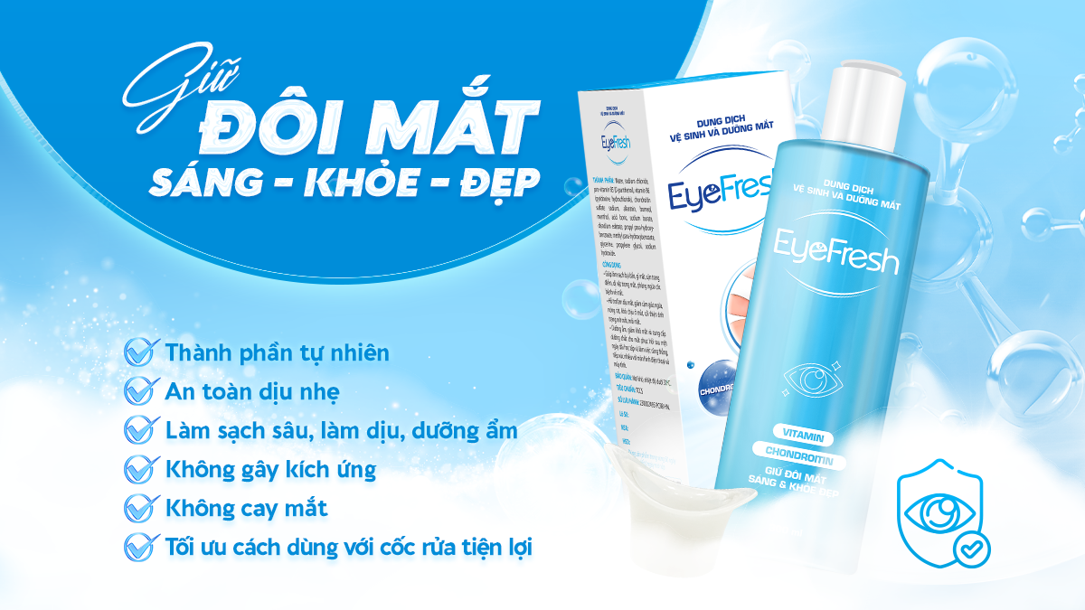 Nước rửa mắt Eyefresh với sự kết hợp hoàn hảo giữa các thành phần tốt cho sức khỏe của đôi mắt như chondroitin, pro vitamin B5, vitamin B6, borneol, allantoin… không chỉ giúp làm sạch sâu, loại bỏ bụi bẩn, gỉ mắt, cặn trang điểm, mà còn hỗ trợ làm dịu mắt, giảm cảm giác ngứa mắt, dưỡng ẩm giảm khô mắt, đồng thời cung cấp dưỡng chất cho mắt. Eyefresh chính là sự lựa chọn hoàn hảo giữ cho đôi mắt luôn sáng khỏe.