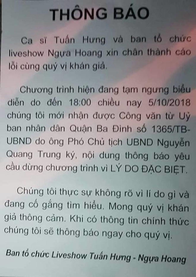 Tối 5/10/2018, ca sỹ Tuấn Hưng tổ chức liveshow kỉ niệm 20 năm ca hát tại Cung tổng hợp thể thao Quần Ngựa (Ba Đình, Hà Nội). Sát giờ đêm diễn bắt đầu, khoảng 19 giờ, các khán giả đến xem show sửng sốt khi thấy trước cổng nơi tổ chức được dán thông báo có nội dung: "Vì lý do đặc biệt, ca nhạc Tuấn Hưng tạm dừng, không biểu diễn". Nhiều người tức giận vì không hiểu chuyện gì xảy ra. Lực lượng Công an quận Ba Đình được cử đến giữ trật tự an ninh khu vực.