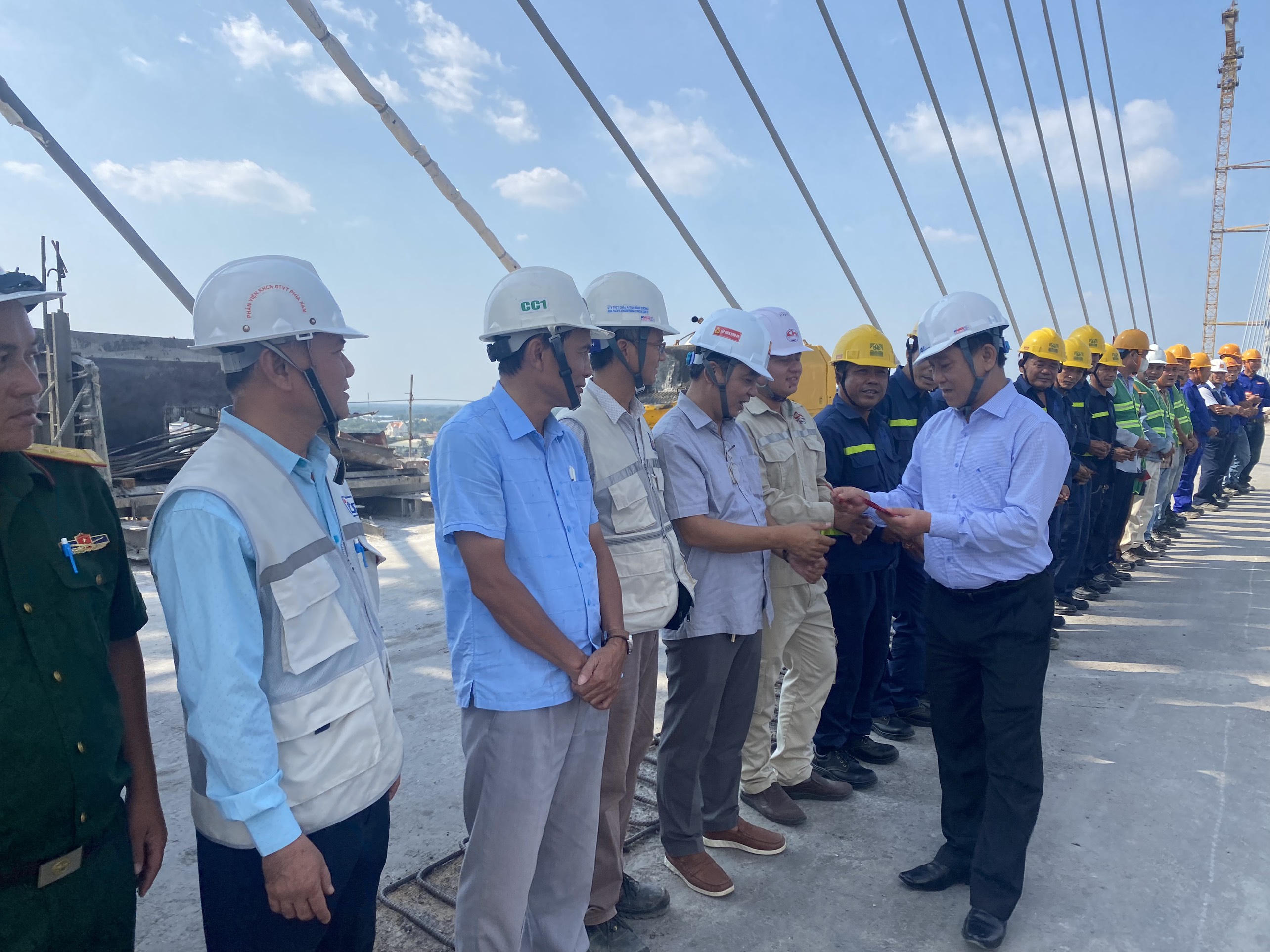 Chủ tịch UBND tỉnh Tiền Giang đến thăm, động viên cán bộ, công nhân lao động tại công trình cầu Rạch Miễu 2. |