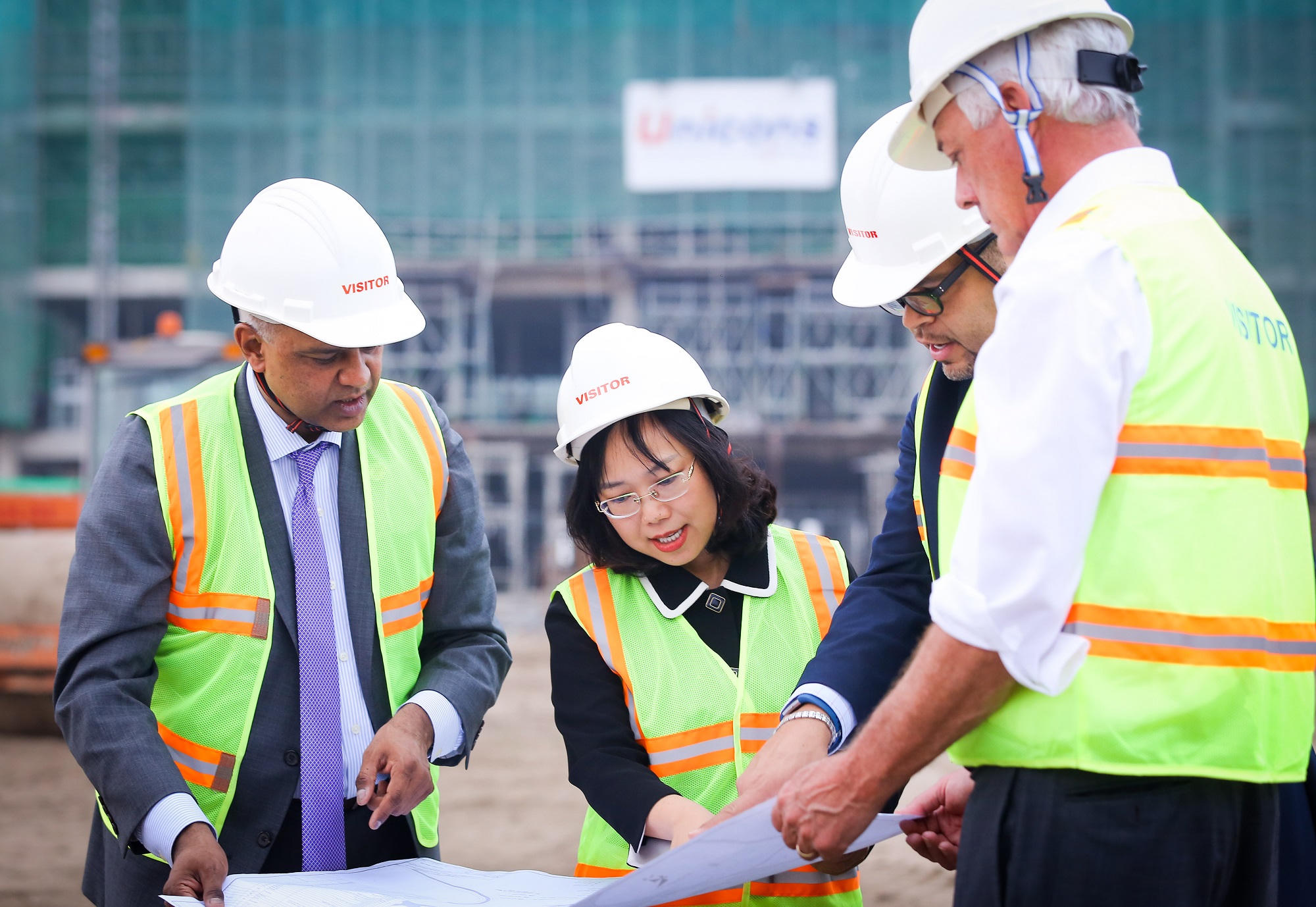 TS. Lê Mai Lan, GS. Rohit Verma cùng các  Giáo sư Cornell trên công trường xây dựng  trao đổi về tiến độ xây ký túc xá và khu labs trong khuôn viên Đại học VinUni