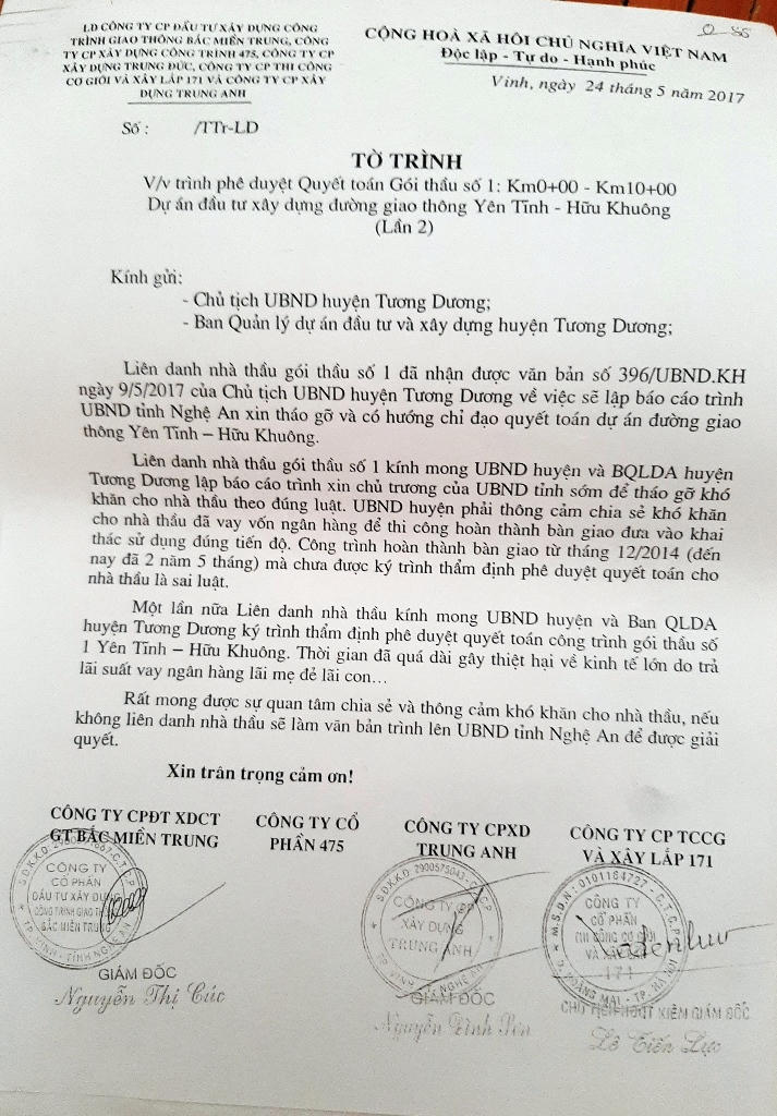 Trả lời huyện Tương Dương, các Sở trên cũng có nhiều văn bản nêu rõ việc xử lý thanh toán cho liên danh các nhà thầu là của UBND huyện Tương Dương.