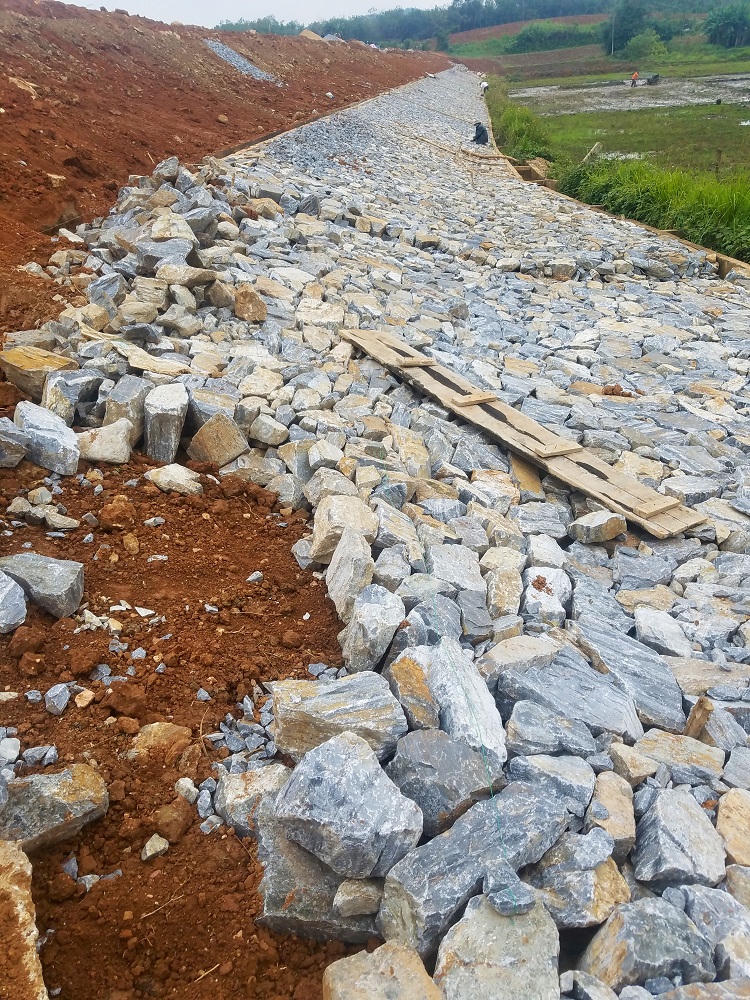 Cũng theo Quyết định 5124 mái hạ lưu từ cao trình đỉnh đập đến cao trình +25,9m được gia cố bằng trồng cỏ. Bố trí rãnh thoát nước xiên kích thước bxh = 20 *20cm, kết cấu bằng bê tông mác 150. Từ cao trình + 25,90m đến chân đập gia cố bằng đá lát khan dày 30cm, dưới lót đá dăm dày 15cm và cát thô dày 15cm. Tuy nhiên, theo quan sát tại hiện trường, công nhân thi công ghép đá trực tiếp xuống nền đất mà không thấy lớp đá dăm và cát thô lót dưới. Ngoài ra, đất đắp pha lẫn nhiều tạp chất và đá nhưng đơn vị thi công vẫn dùng để đắp thân đập; sắt dùng để thi công thì hoen gỉ...