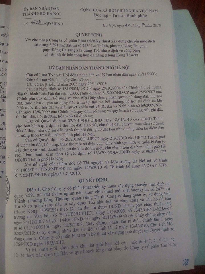 Ngày 22/7/2010, UBND TP Hà Nội đã có Quyết định cho phép Công ty CP Phát triển Kỹ thuật Xây dựng chuyển mục đích sử dụng 5.591 m2 đất tại số 243A Đê La Thành, phường Láng Thượng, quận Đống Đa sang xây dựng Tòa nhà ở dịch vụ công cộng và căn hộ để bán tổng hợp đa năng (Hong Kong Tower).