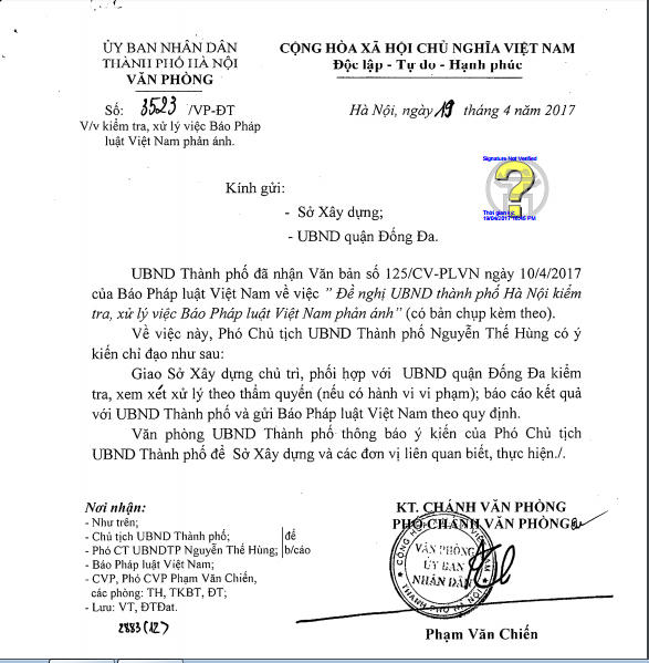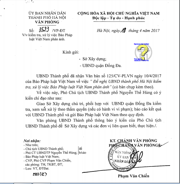 Giao Sở Xây dựng chủ trì, phối hợp với UBND quận Đống Đa kiểm tra, xem xét xử lý theo thẩm quyền ( nếu có hành vi, vi phạm ) báo cáo kết quả với UBND Thành phố và gửi báo Pháp luật Việt Nam theo quy định.